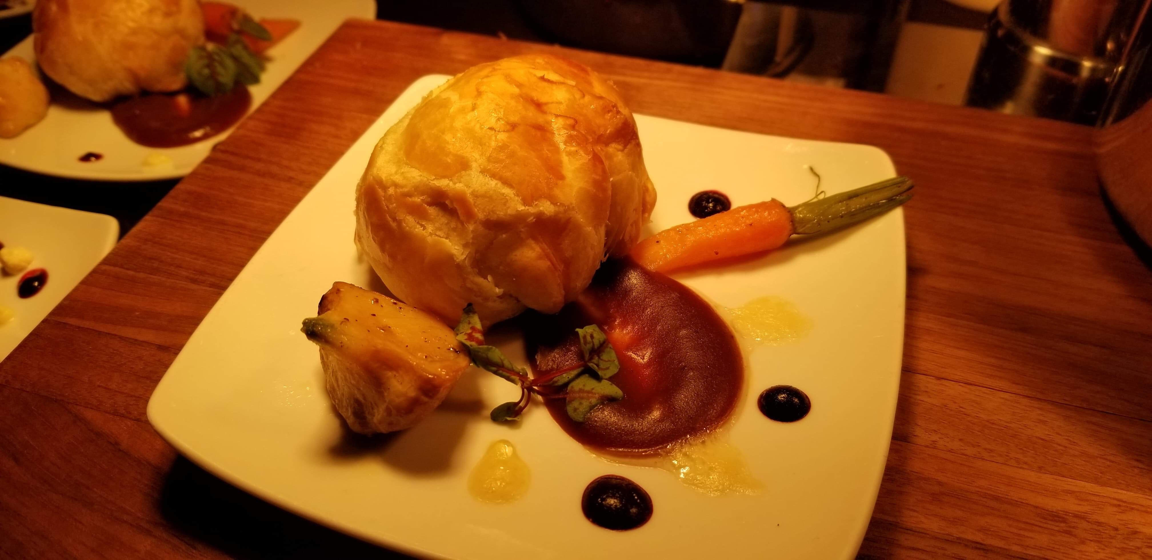 There is more to this than meets the eye! Beneath this perfectly golden brown crust is a savory beef surprise waiting to tickle your tongue. This Beef Wellington includes Mushroom Bordelaise, fennel Cream, and Roasted Baby Vegetables. Get yours at The Artist’s Table in The American Adventure.
