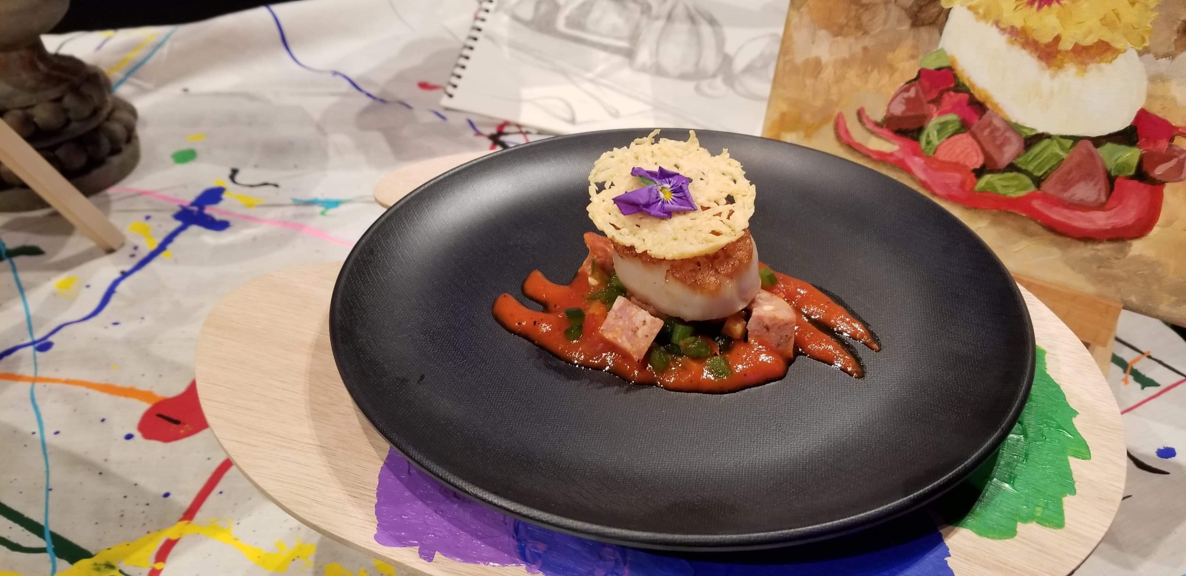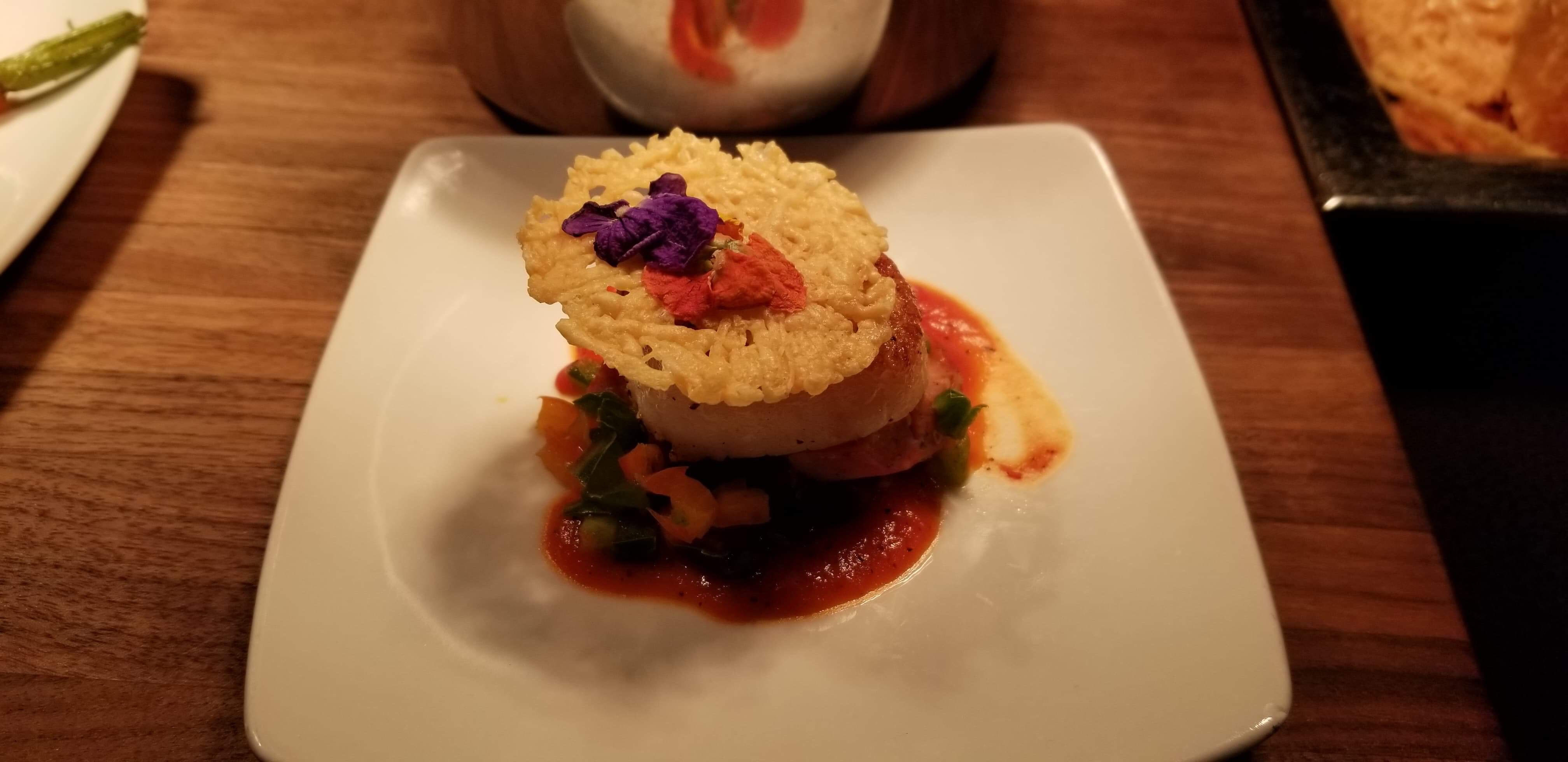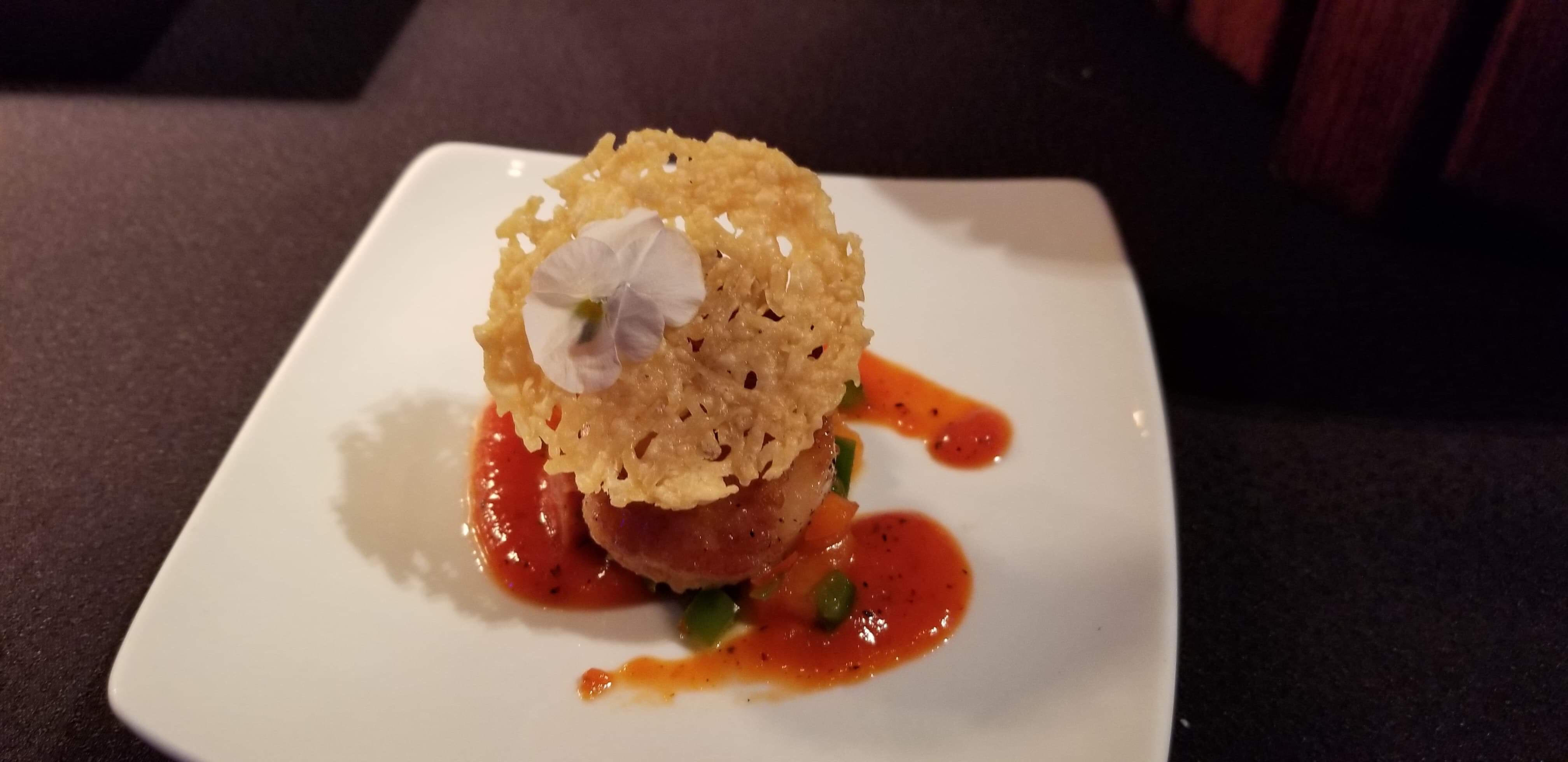 For another savory option you can get the Pan-Seared Scallop with Chorizo, Roasted Red Pepper Coulis, and Parmesan Crisp. This scallop is available at The Artist’s Table in The American Adventure.