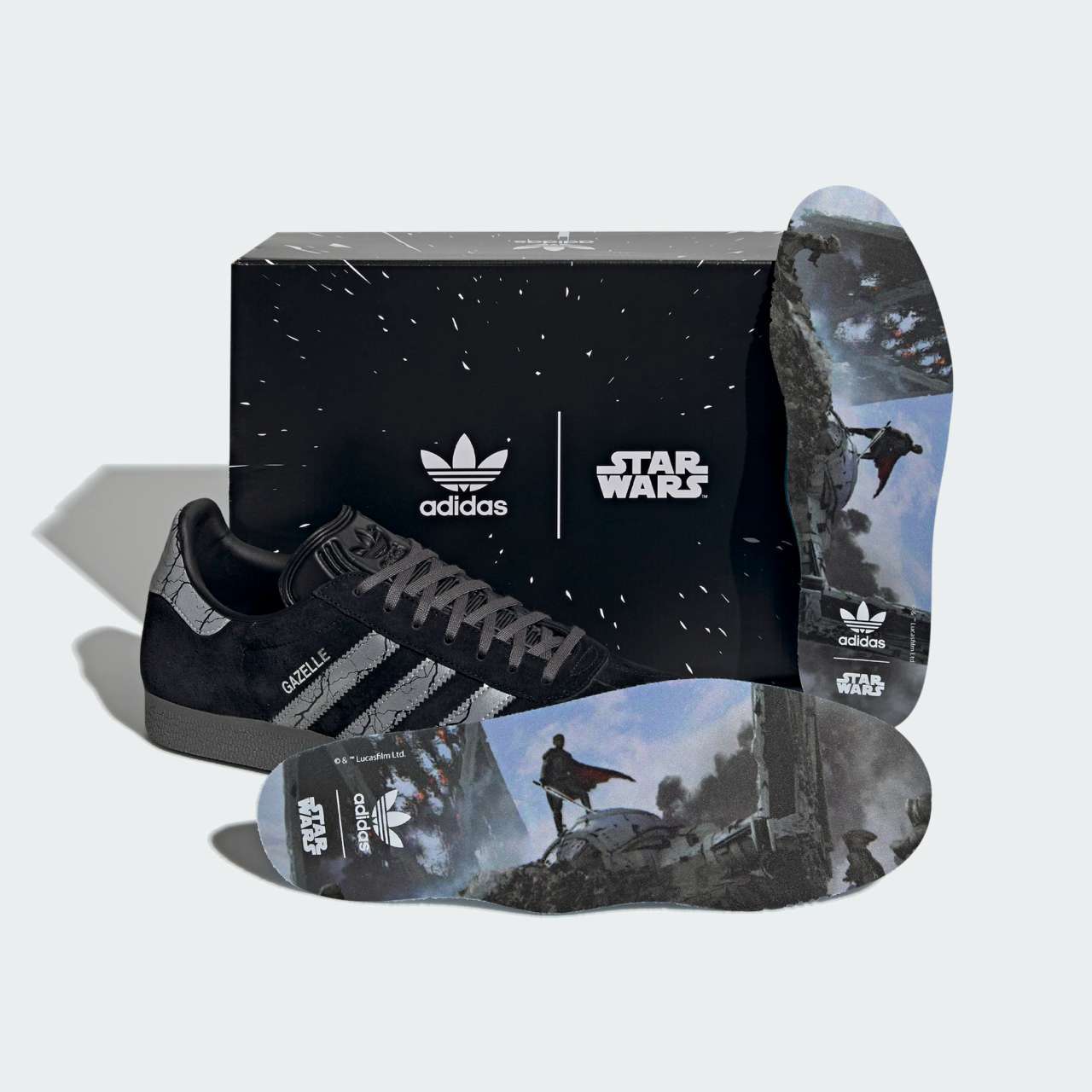 “From the Star Wars: The Mandalorian Collection, debuting nine shoes tributed to the galaxy’s greatest characters and moments from the series, see the Gazelle shoes appear as if they are the Darksaber. Making an unexpected return, the Darksaber is a one of a kind black bladed lightsaber. Designed with glowing 3-Stripes that honor the sword. If you know, you know.”