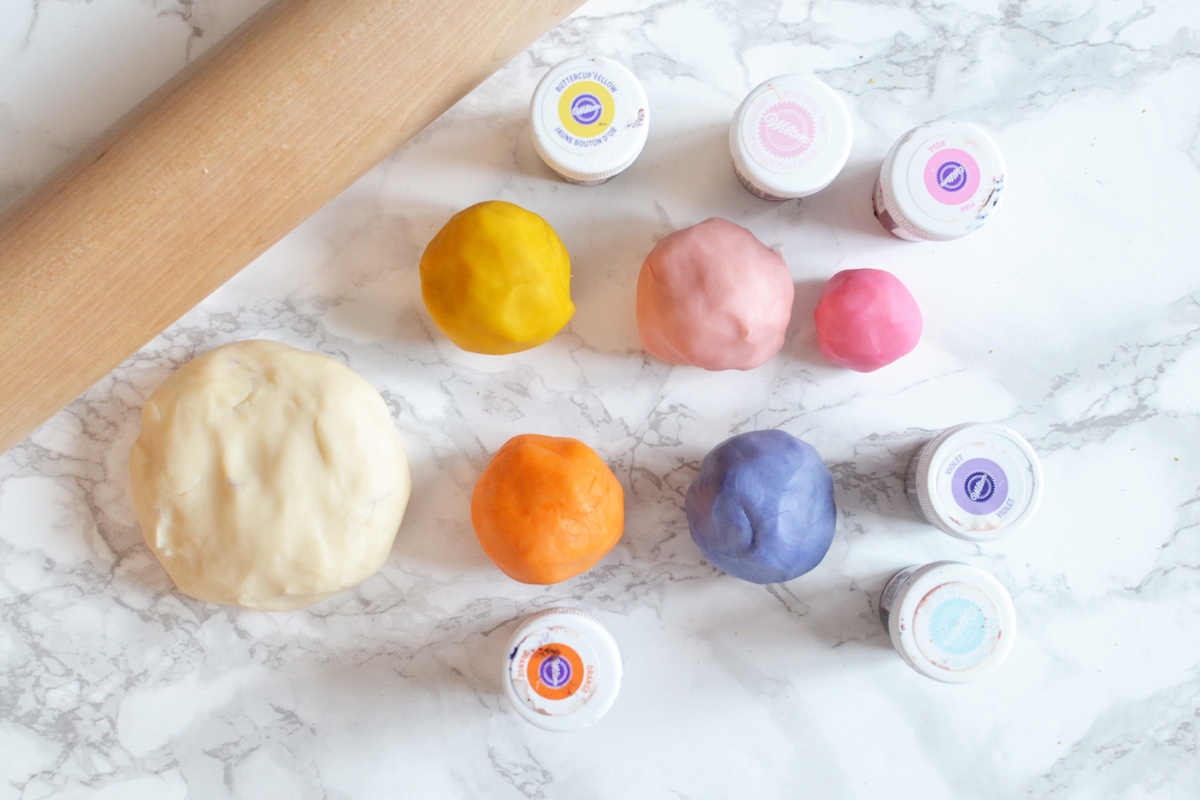 - Roll out the pie dough and divide it into 4 equal rounds. Using toothpicks, color each mound of dough with the colors of each character and knead until colors are incorporated. Use the yellow for Pooh, pink for Piglet, orange for Tigger, and purple for Eeyore. For Piglet’s ears, color a small amount of dough with the deep pink.
