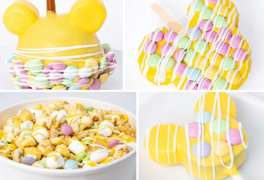 - Mickey Spring Caramel Apple: Granny Smith apple covered in caramel, dipped in yellow-colored chocolate coating with Springtime M&M’s Milk Chocolate candies, and drizzled with white chocolate (New)