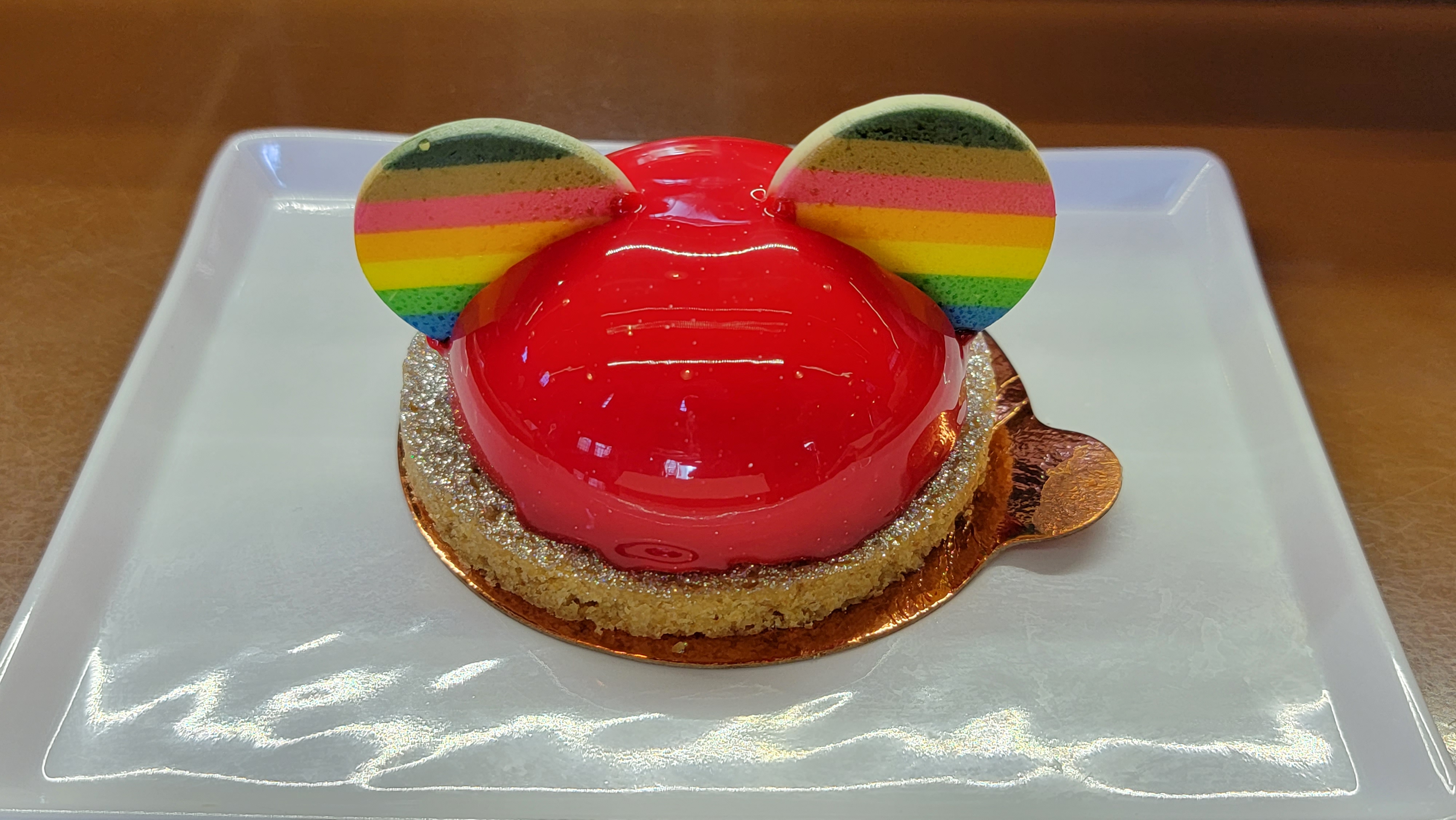 The next snack was Pride Dome Mickey Hat: Whipped berry white chocolate cheesecake with a rainbow sparkle graham cracker cookie, glazed with a red-colored white chocolate shimmer mirror glaze, and topped with Mickey Pride ears available at The Trolley Car Café. Also available for $5.99