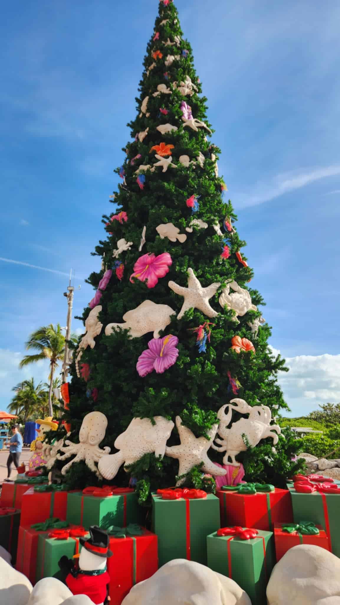 From the moment you disembark, the holiday spirit surrounds you. At the entrance to the island, a towering Christmas tree adorned with floral ornaments, sand creature decorations, and shimmering baubles greets you. Nearby, Mickey’s sleigh, loaded with presents, beach chairs, and Mickey-themed life preservers, adds a playful touch. These decorations offer the perfect backdrop for your family’s holiday photos and might even inspire ideas for your own Christmas tree back home.