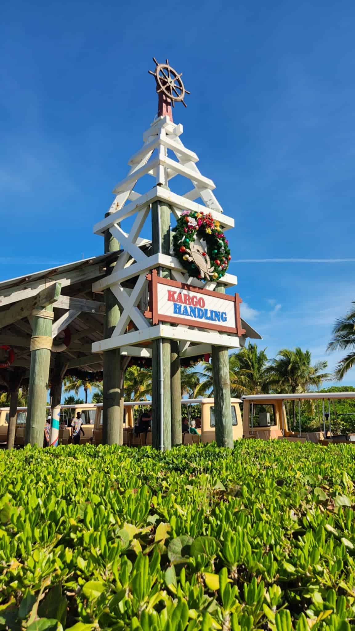 The buildings throughout Castaway Cay are also all decked out for the holidays. Nearly every structure has been adorned with festive wreaths, garlend, and other decorations with a nautical flair.