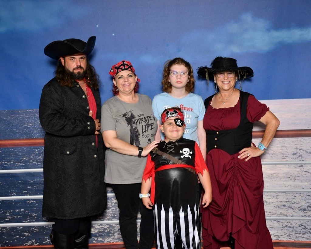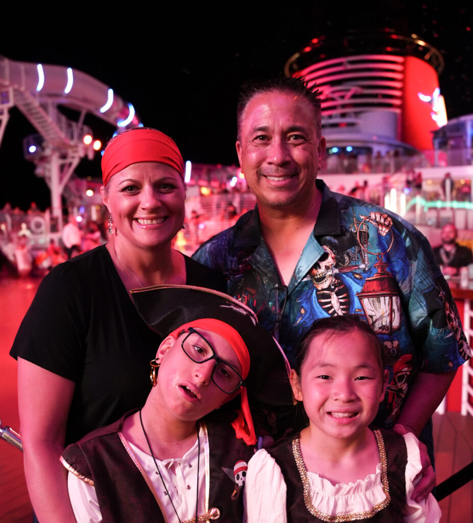 Anthony DiDonato, 17, from Colorado, loves cruising and enjoyed his first time on a Disney Cruise Line ship. Anthony’s younger sister Aubrey, 10, said that Anthony was “really happy” during the sailing, adding that “he loves spending time with his family.” Anthony, Aubrey, their parents, and members of their extended family donned pirate garb for the Pirates in the Caribbean deck party, where they danced in the glow of fireworks over the upper decks.