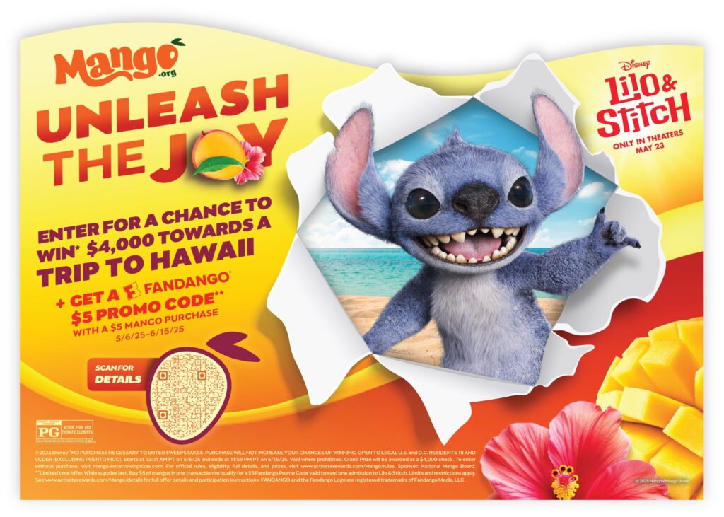 “Families go grocery shopping together, so there’s no better tie-in than mangos to create the perfect Ê»Ohana vibe, also with an opportunity to win big,” said Ramón Ojeda, executive director at the National Mango Board. “This collaboration allows us to highlight the unique connection between fresh mangos and the Hawaiian Islands, while celebrating the spirit of ‘Ê»Ohana’ and the pure ‘hau’oli’ that both NMB and this beloved Disney story represent.”