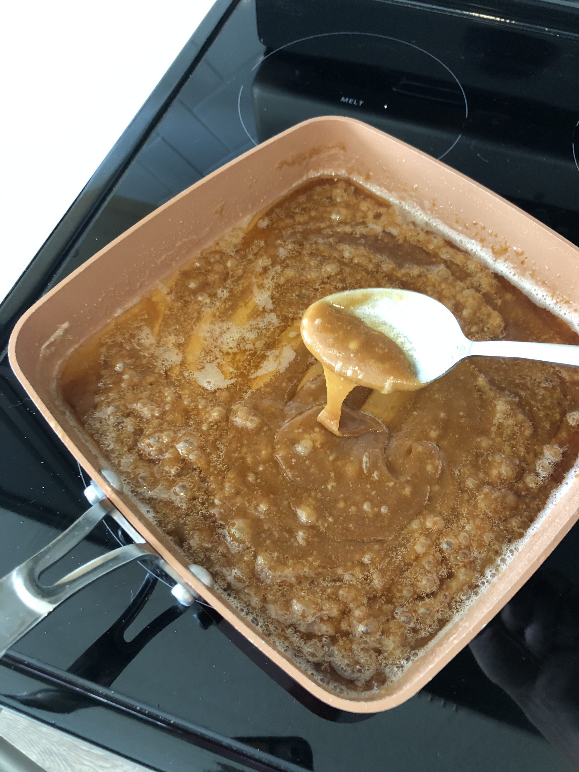 - While the bread pudding is baking, add corn syrup, butter, ½ cup sugar, and ½ cup sugar to a saucepan. Bring to a low boil, then slowly add heavy cream, maintaining the boil. Add rum and flambe (skip this step if using extract). Cook for 10-15 minutes or until caramel reaches 235 degrees (soft ball stage). Remove from heat and add extract and salt. Cool slightly.