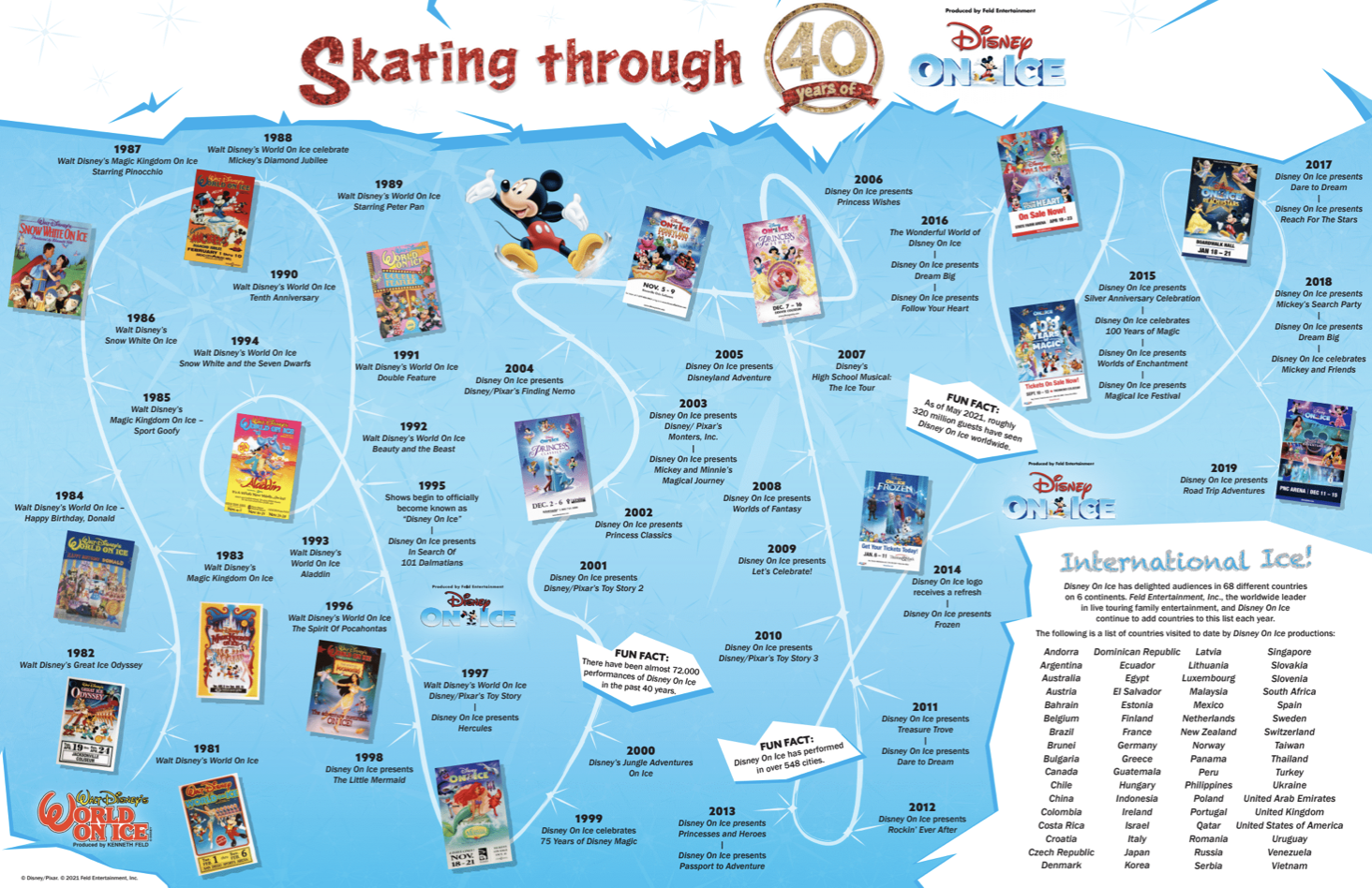 “Everything you do in life starts with one small step. The first Disney On Ice show premiered in 1981 and we are still bringing happiness to generations of families 40 years later. When we started it we never knew it would last this long. Disney On Ice is ever-changing and there are always surprises for all of our Disney fans. That’s the key. As long as we continue to do that Disney On Ice will always be around. We are grateful for the 320 million-plus fans who have seen Disney On Ice in over 68 countries, the Feld Entertainment Associates who have contributed to the success and The Walt Disney Company for 40 years of Disney On Ice.”