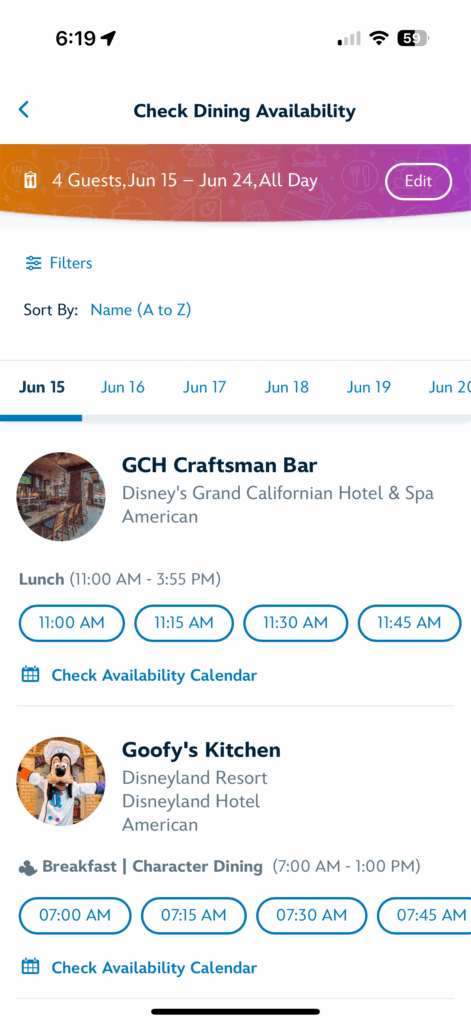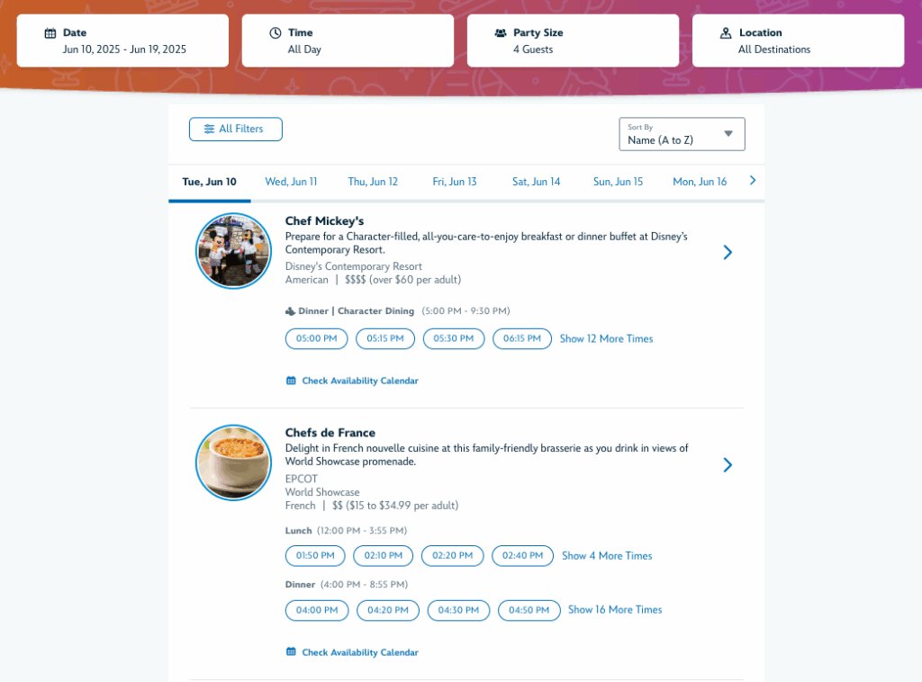 - New filters and labels: For guests looking for something specific, our search function will have new features that let you filter by location, meal type(breakfast, brunch, lunch, and dinner), and for our Walt Disney World guests, by Disney dining plans. It’s also easier to see which dining reservations offer Disney character dining experiences.