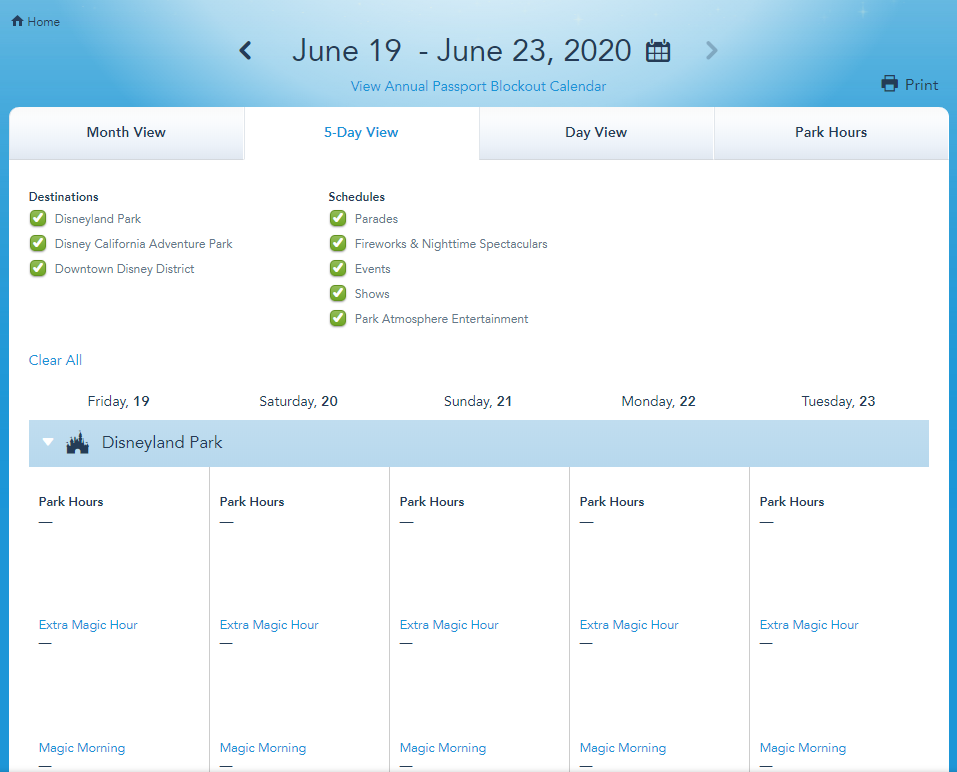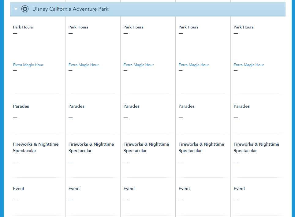 Disneyland recently announced that new reservations can’t be booked before July 1st. Now park hours for the Disneyland Resort are no longer showing on the website through June 23rd.