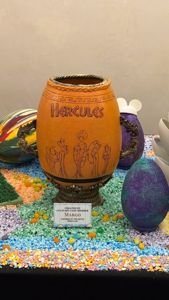 - The Muses (Inspired by “Hercules”): Margo’s artistic touch is evident in an orange egg styled like a Greek vase, complete with an ornate gold base and handles, painted with black line art depicting all five Muses and the “Hercules” wordmark.