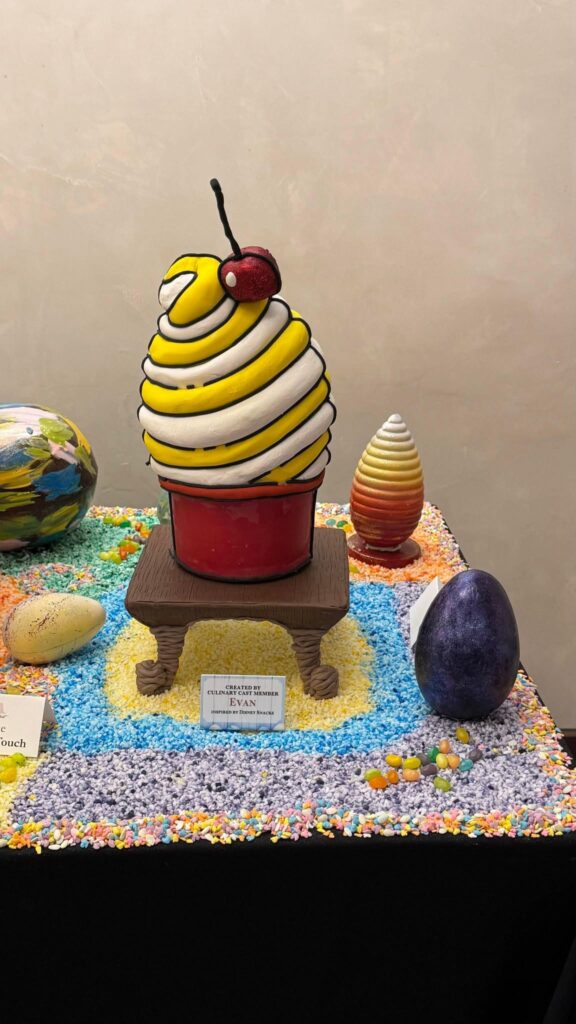 - Dole Whip: Created by Evan, this egg perfectly captures the iconic Disney snack. Swirls of yellow and white chocolate sit atop a red base, mimicking the cup, and are crowned with a charming chocolate cherry.