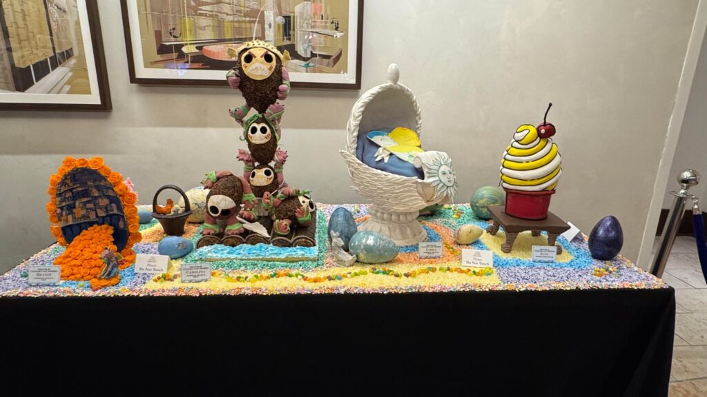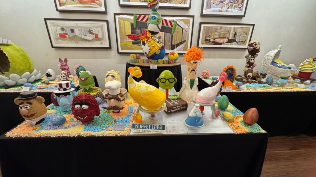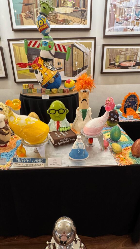 The entire collection of meticulously crafted chocolate eggs is presented on three folding tables draped in elegant black tablecloths. This concentrated display allows guests to fully immerse themselves in the creativity and detail poured into each piece. True to Disney tradition, the majority of the eggs draw inspiration from beloved Disney and Pixar animated classics. What’s particularly exciting this year is that all the showcased eggs appear to be brand new designs, offering a fresh wave of delightful discoveries for returning visitors.