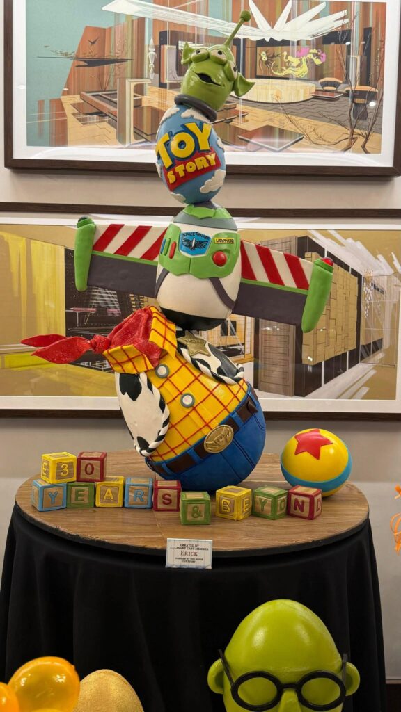 - “Toy Story”: Erick’s towering structure, celebrating the film’s 30th anniversary, features a stack of four eggs alongside wooden blocks spelling out “30 Years” and the iconic Pixar Luxo Ball. The bottom egg sports Woody’s signature cowboy attire, followed by a green egg with Buzz Lightyear’s wings and buttons, a sky-patterned egg with the “Toy Story” logo, and finally, the head of a Little Green Man.
