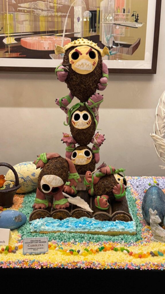- Kakamora (Inspired by “Moana”): Carolina’s impressive multi-tiered display features three stacked brown, textured eggs resembling the coconut-clad pirates, flanked by two more Kakamora. They sit upon a chocolate log raft amidst swirling chocolate waves. An unlabeled chocolate basket nearby holds a small chicken and a white token painted with the resort’s unique five-legged goat.