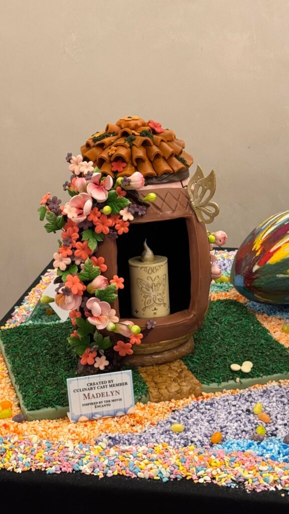 - The Miracle Candle (Inspired by “Encanto”): Madelyn’s final egg captures the magic of Casa Madrigal, with pink flowers climbing its sides and a hollow center revealing a 3D sculpture of the iconic Miracle Candle.