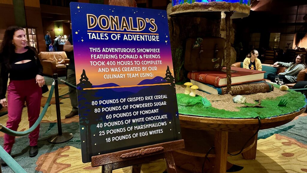 The display sign proudly reveals the dedication poured into this “adventurous showpiece featuring Donald & friends”: a staggering 400 hours of meticulous work by the talented Disney Culinary Team, brought to life using the following delectable ingredients: