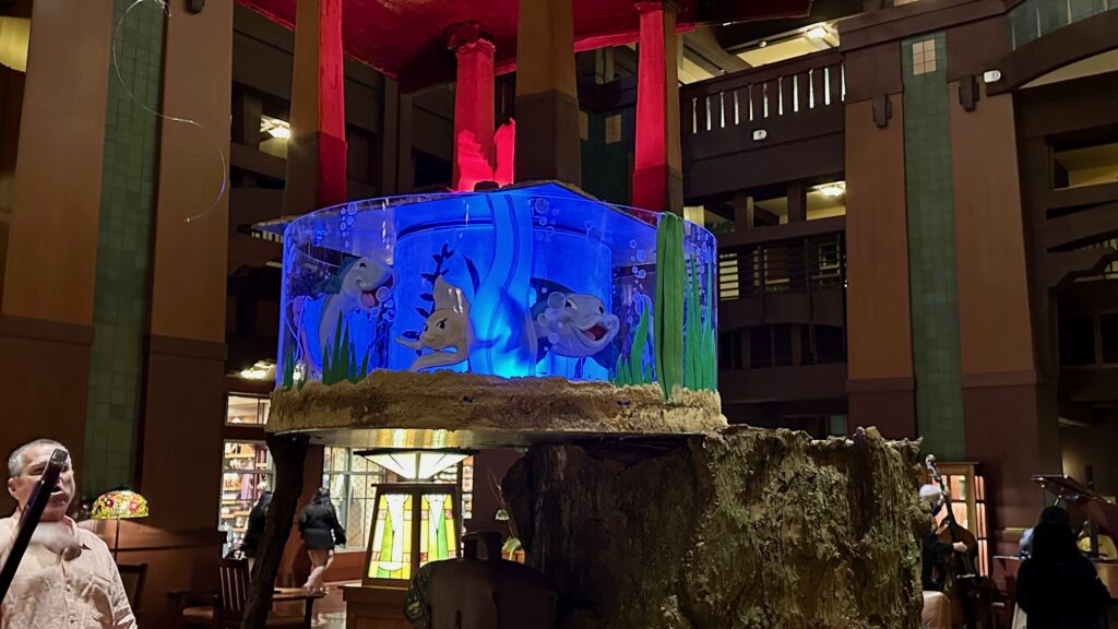 Descending further down the chocolate creation, our eyes are drawn to the campfire scene, encircled by artfully placed smaller chocolate rocks just above the circular “fish tank.” Within this edible aquarium, several sculpted fish appear to be swimming. Notably, one bears a striking resemblance to the fish version of “The Incredible Mr. Limpet,” a clever Easter egg also found in The Little Mermaid – Ariel’s Undersea Adventure at Disney California Adventure.