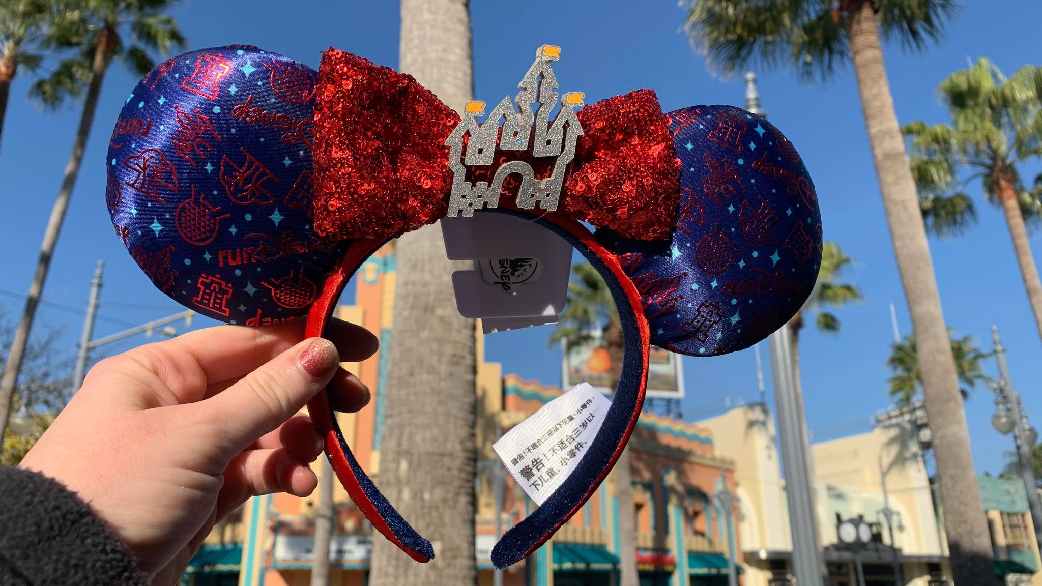 We get a fabulous pair of Minnie ears this year celebrating runDisney! These have the runDisney castle design adorning a red sequined bow. While the ears are a satiny blue with park icons, and the runDisney logo.