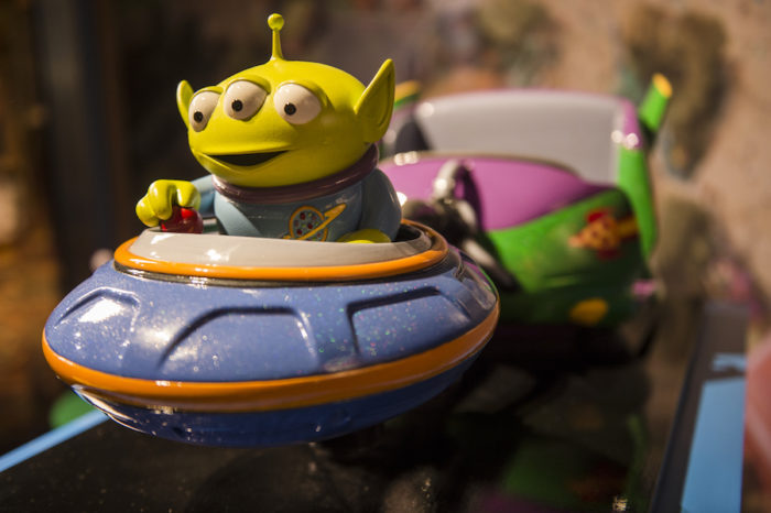 Here is a close-up of the Alien Swirling Saucers ride vehicle maquette on display at Walt Disney Presents.