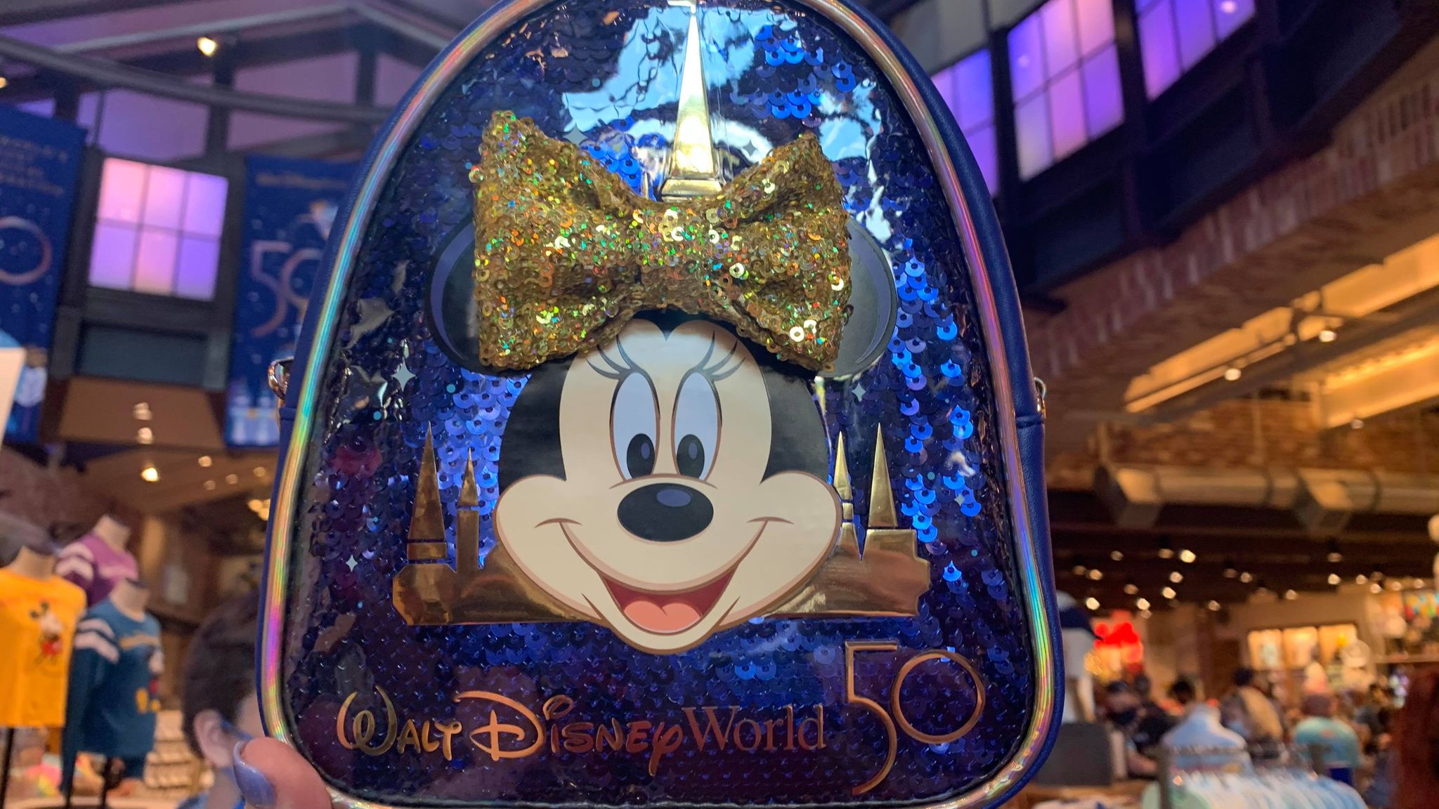 Finally, we have a Minnie Mouse sequin backpack! This bag shimmers and shines, and even has a gold sequin bow!