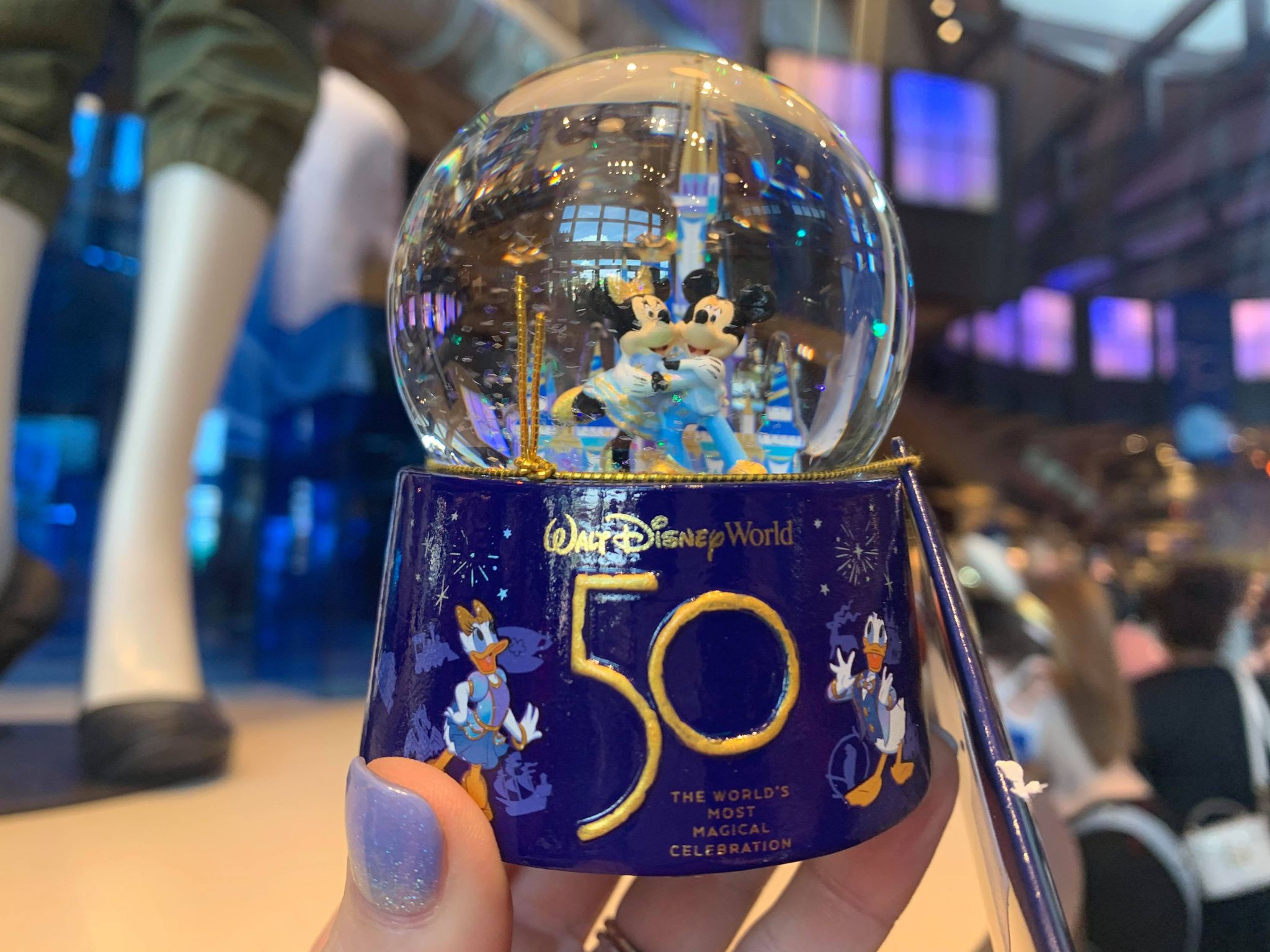 First up we have the mini snowglobe! This is a dainty globe shimmers in the anniversary blue and gold, with Mickey and Minnie dancing in front of the castle. Irridescent confetti floats all around them when you shake it up.