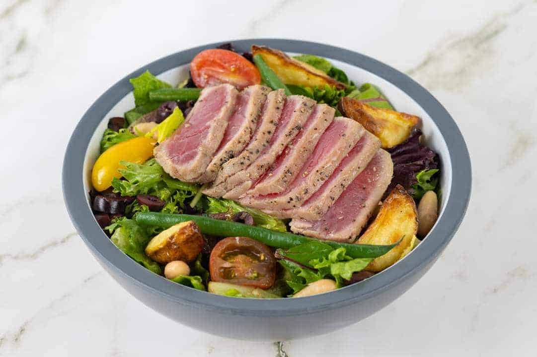 Niçoise-style Salad with Seared Tuna: Crispy mixed greens, wedged potatoes, tomatoes, olives, green beans, white beans, dijon vinaigrette, and tuna