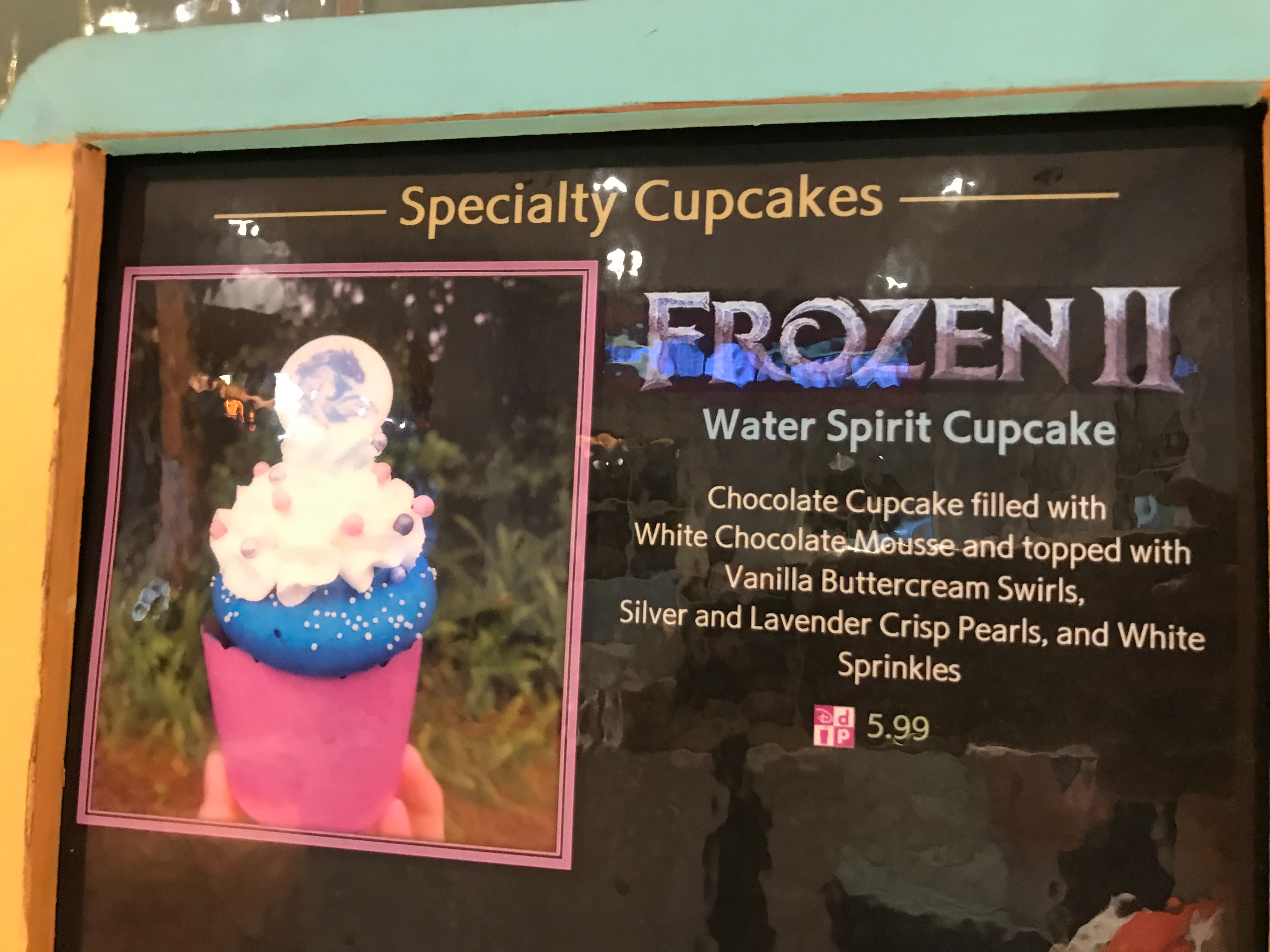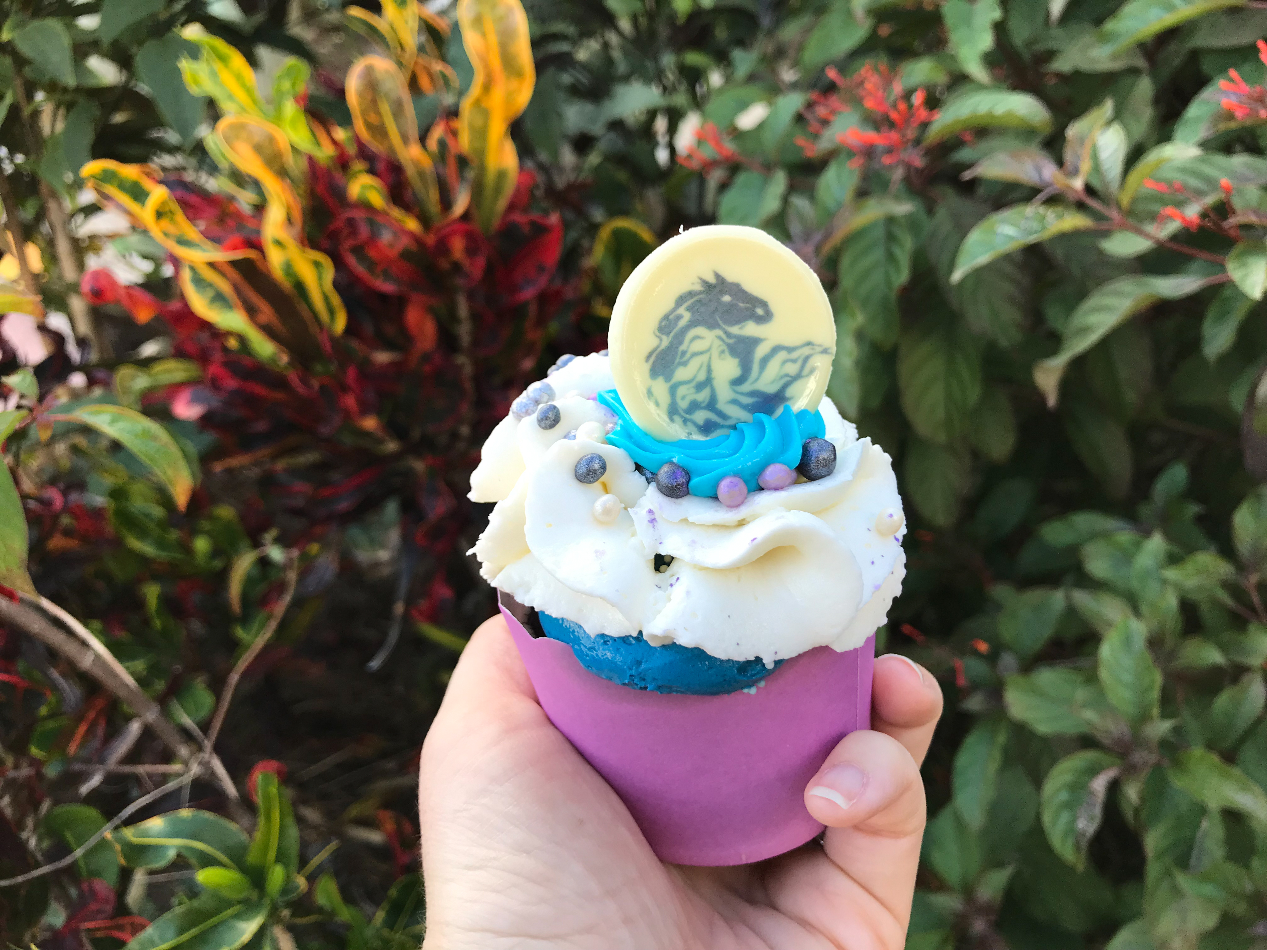 If you are a fan of Frozen II and sweet treats we found something for you! There is a brand new Frozen II Water Spirit Cupcake at the Caribbean Beach Resort. It features the images of Elsa and The Nokk which is the horse water spirit from the movie! It also has the color palette Elsa portrays in the new movie with whites, blues, and purples.