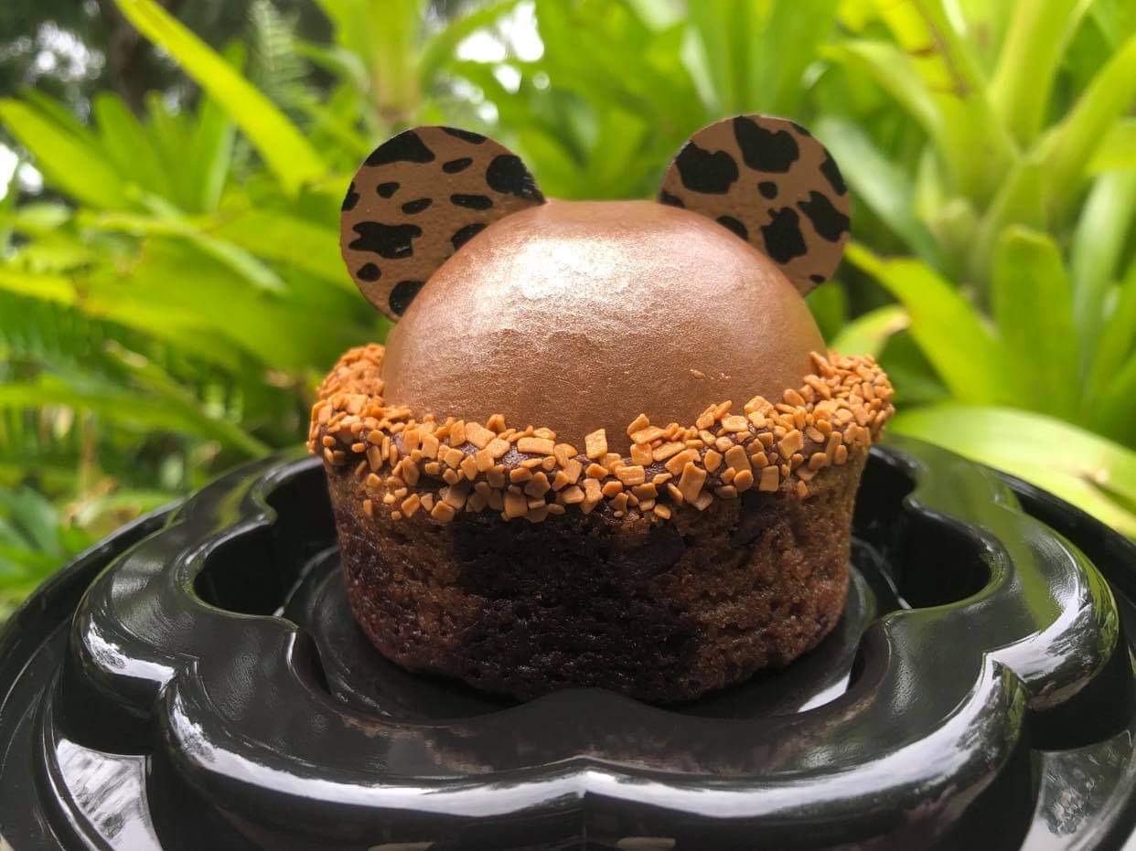 The dessert is a “brookie” treat, which mean it’s actually half brownie and half chocolate chip cookie. The top part is covered in mocha mousse and golden sprinkles. Finally, a pair of cheetah Mickey ears sits on top to complete the ensemble.