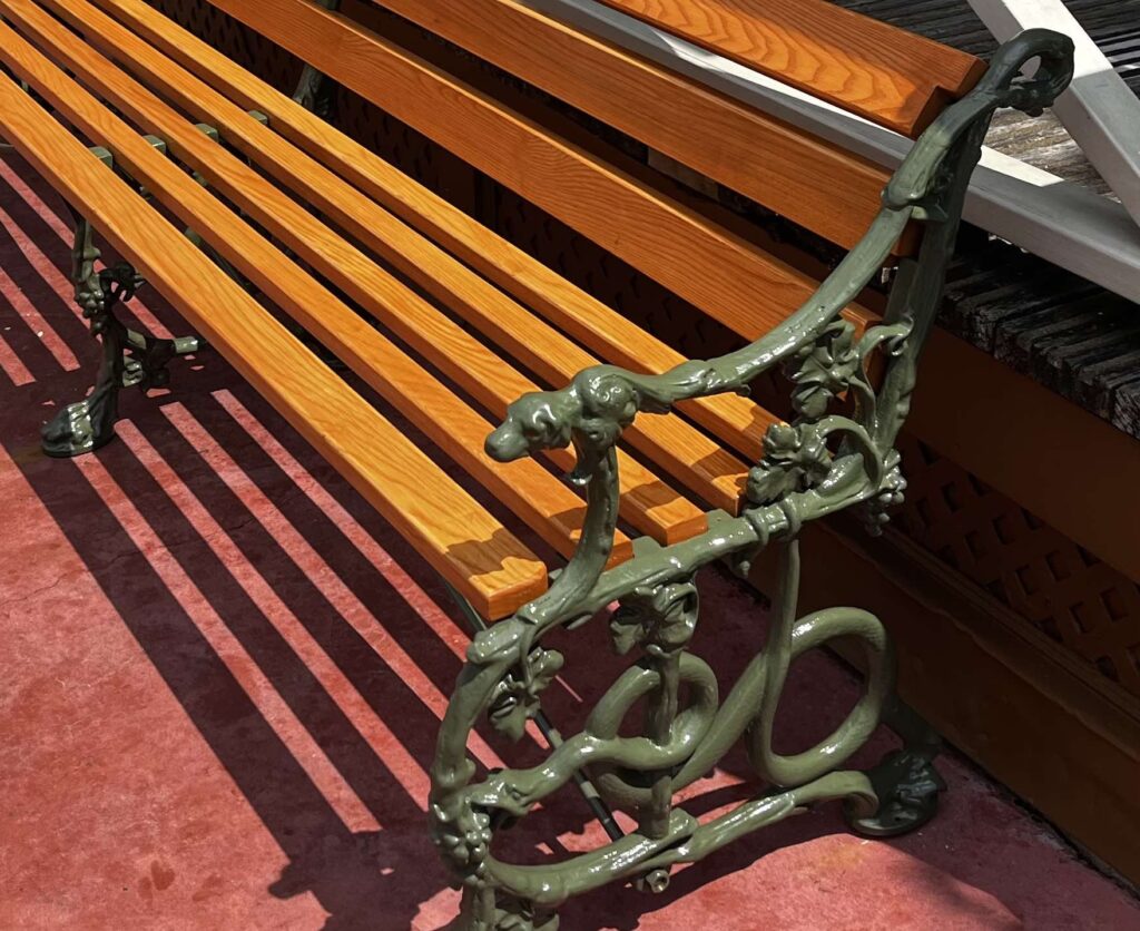 The returning bench sits to the right of the stairs leading to Memento Mori’s porch, blending right into the eerie aesthetic of Liberty Square. Crafted from light brown wooden planks, the bench features green metal armrests and legs—but look closely and you’ll notice the true (ghost) story behind this seating.