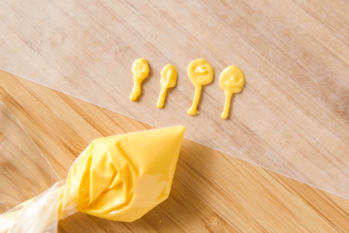 - Cut off the bottom corner of each sandwich bag to use for piping. Using the yellow candy, pipe out ears and feet onto wax paper. Pipe a little extra at the bottom of the ears and feet so you can attach them to the donut holes.