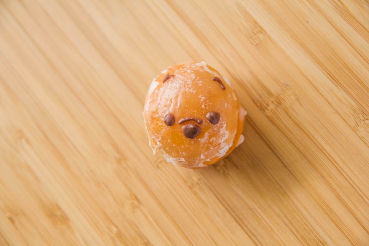 - Next, pipe out Pooh’s face onto each donut hole using the milk chocolate candy melts.