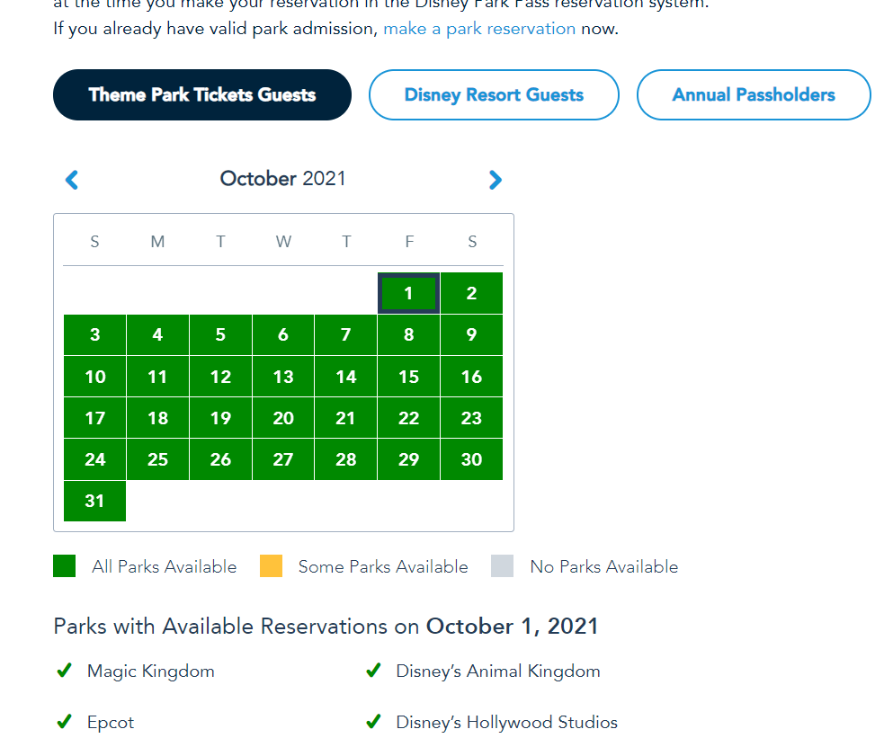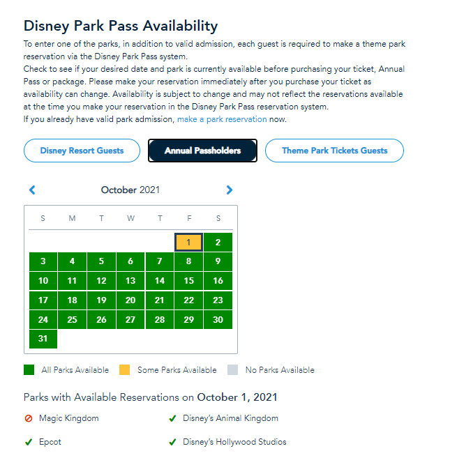 Disney park pass reservations for Magic Kingdom on October 1, 2021, are filling up and Disney Resort hotel reservations are being made. As of today, Annual Passholder park pass reservations for that day are completely full!
