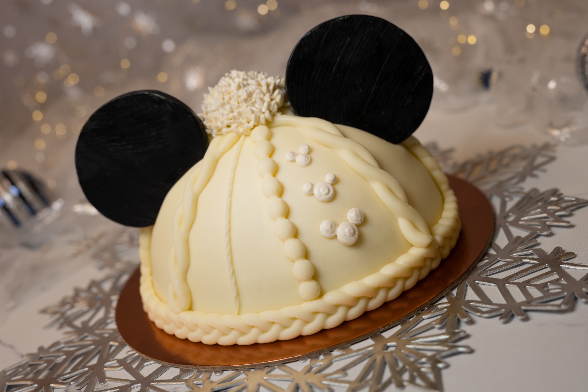- Mickey Winter Hat Dome Cake: Layers of vanilla chiffon, chai tea mousse, cranberry-cherry pâte de fruit, almond crunch, and brown butter ganache (New)