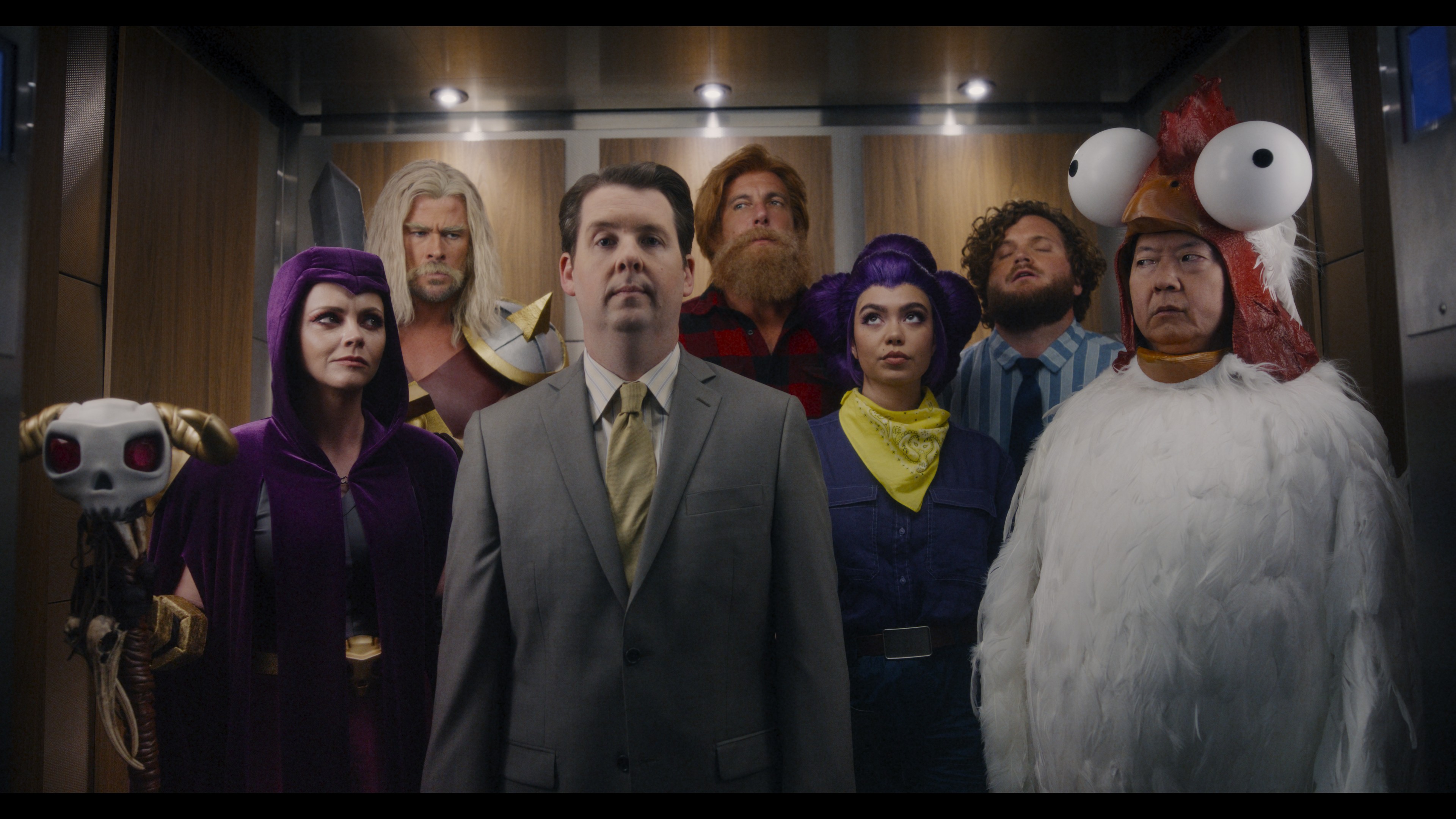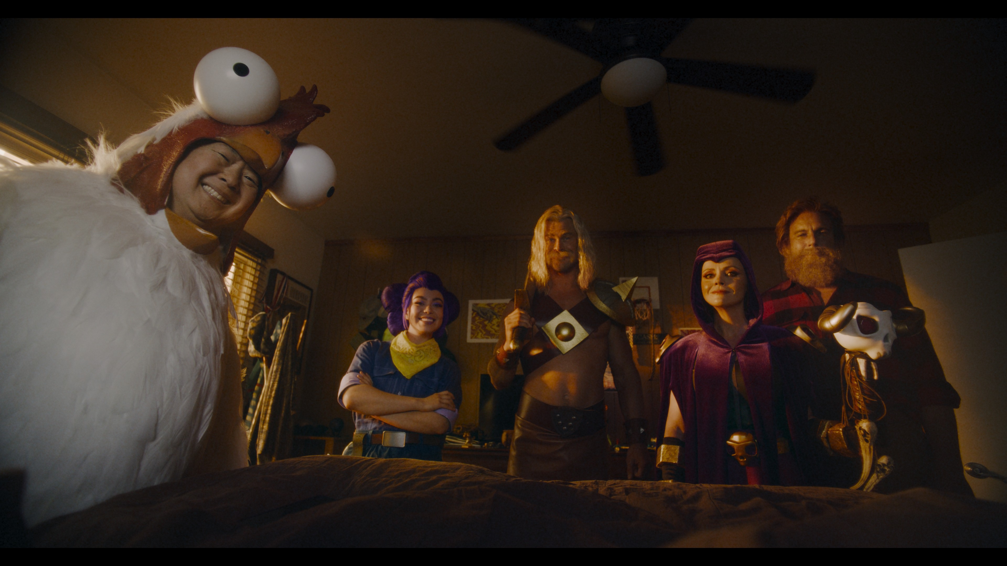 The Hollywood gang, while quipping about Ricci’s skeleton-summoning staff, encounter another player’s squad whose characters are played by Internet sensations including TikTok superstar Bella Poarch as Witch, real-life woodcutter Thoren Bradley as Greg, lip-syncing legend Gabriela Moura as Shelly and YouTube extraordinaire ZHC as Chicken.