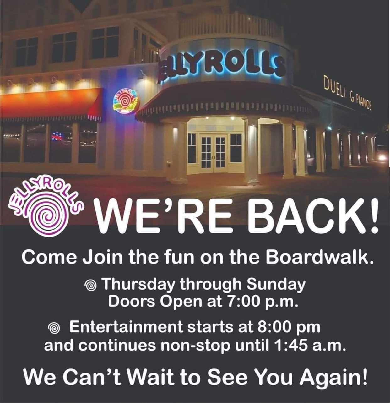 Jellyrolls is open from Thursday through Sunday starting at 7 pm. Entertainment starts at 8 pm and runs through 1:45 am.