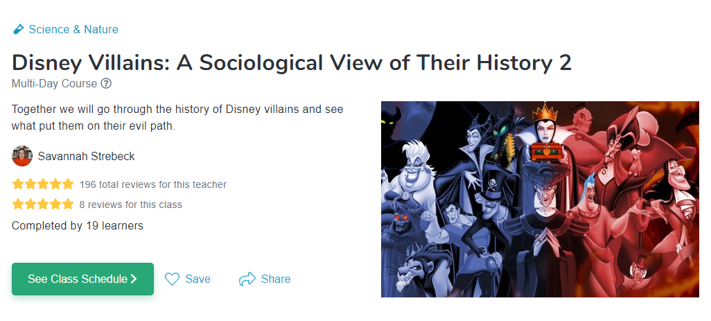 Have you ever wondered why Disney villains are the way they are or what made them go the evil way? Well now you can find out why and learn more about their backgrounds with this fun online class from Outschool.Â