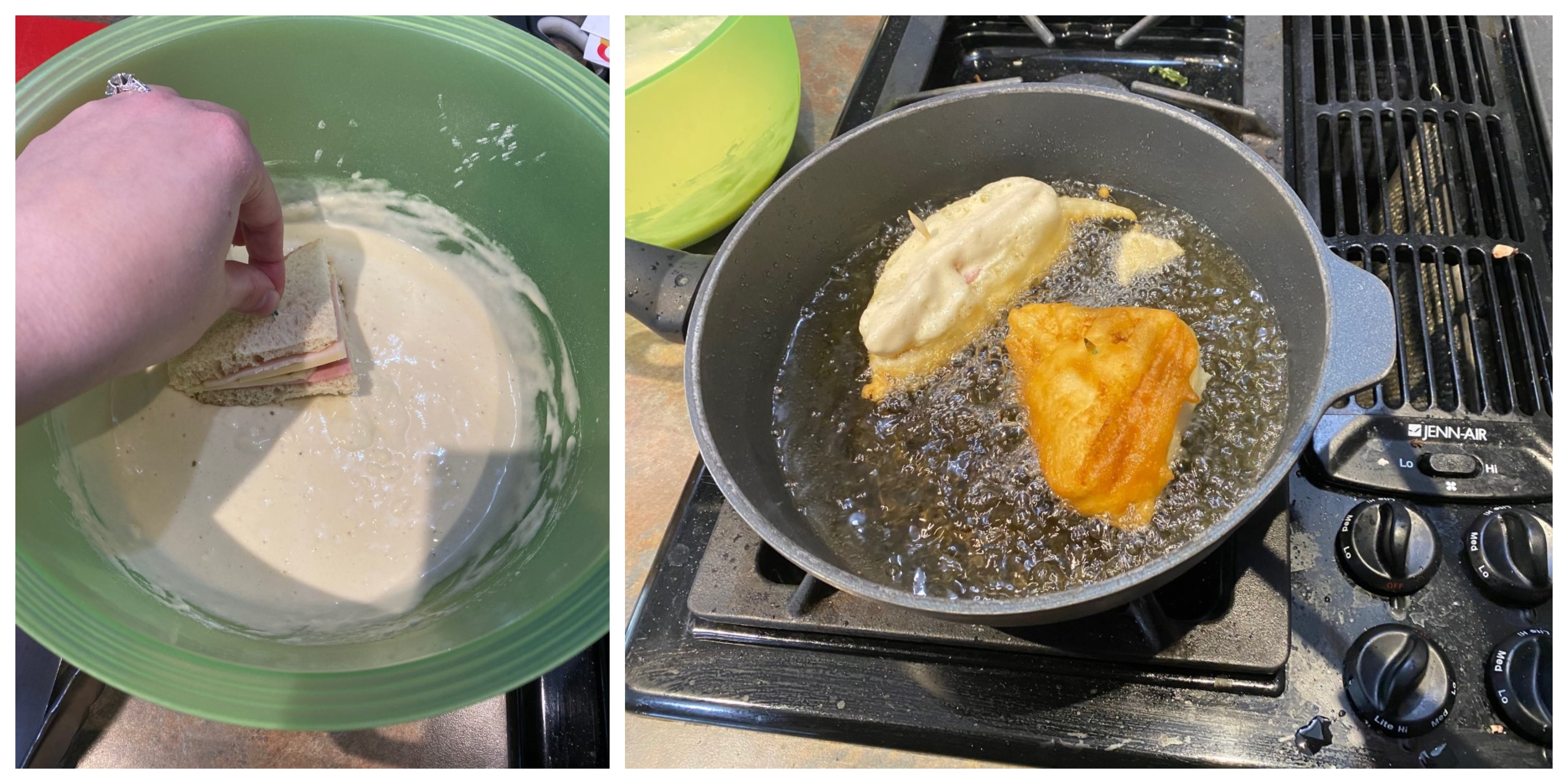 Heat oil to between 365 degrees F and 375 degrees F in a 10-inch pan. Do not let the oil reach a higher temperature than this; if the oil starts to smoke, turn the heat down. Dip each sandwich piece into the batter, allowing excess to drain, and very carefully place into the oil. Cook 3 minutes on each side, or until golden brown. Place the cooked sandwich on the prepared cookie sheet in a warm oven until ready to serve. Repeat with the other sandwiches. I found that my batter was enough for 3 sandwiches.