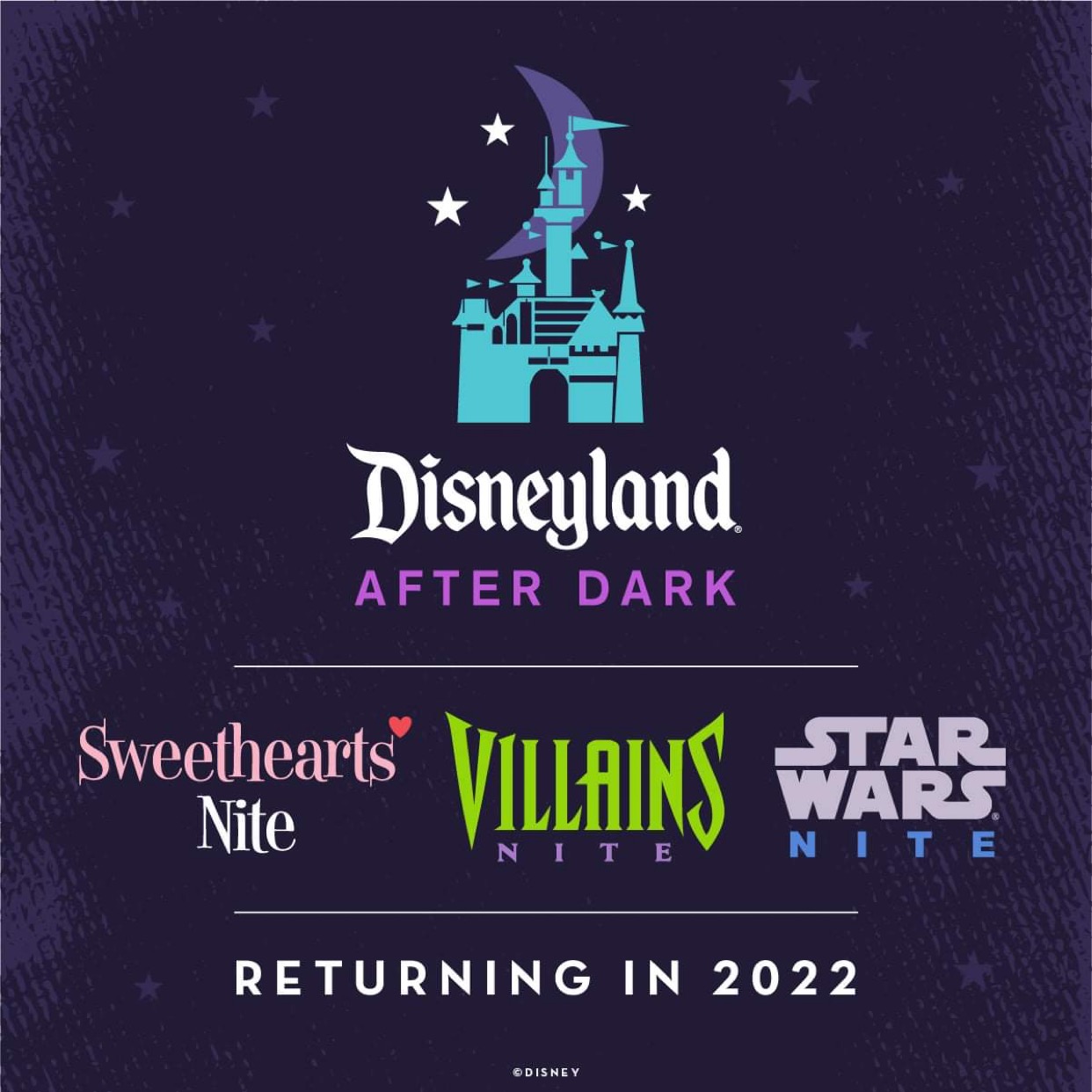 Disneyland After Dark** events returns with more “Nites” of after-hours fun on select nights in 2022. Sweethearts’ Nite will be presented on five evenings in February at Disneyland, Villains Nite on two evenings in March at Disney California Adventure, and Star Wars Nite on three evenings in May at Disneyland, including the eve of May the 4th. That’s more nights than ever before for these limited-time events that have unique themes, character experiences, special nighttime entertainment, and more. Tickets are limited and will be available at Disneyland.com/DisneylandAfterDark, with sales for Sweethearts’ Nite beginning Dec. 9, 2021, and sales for Villains Nite and Star Wars Nite beginning Jan. 11, 2022.