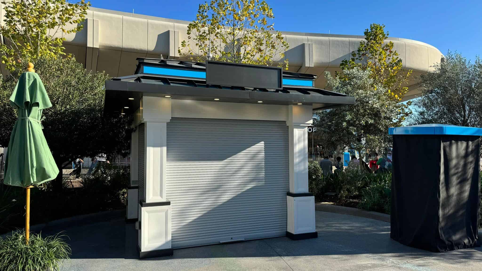Both kiosks are identical in design: square-shaped with dark roofs adorned with a blue stripe encircling all four sides. The structures themselves are white, equipped with metal roll-up doors on every side. Presently, the signs on both kiosks remain blank, and each is accompanied by a freestanding umbrella.