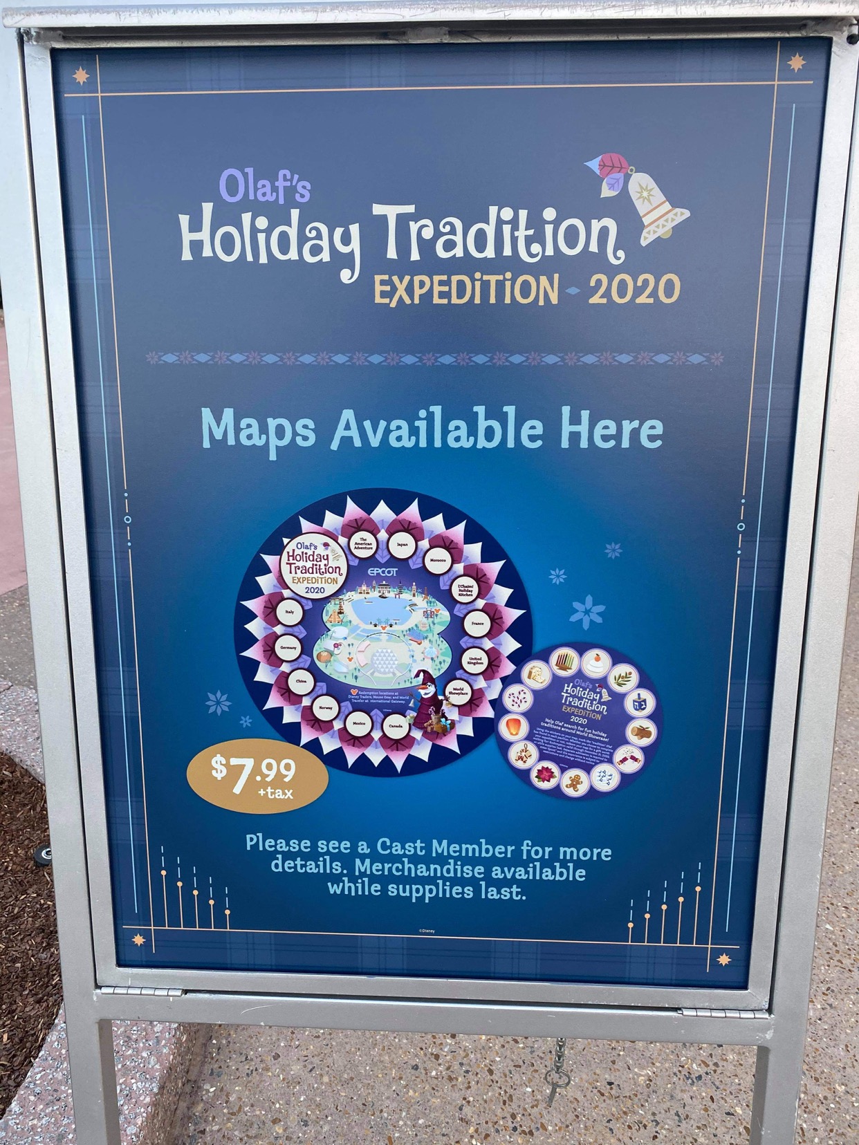Olaf’s Holiday Tradition Expedition is optional for guests and costs $7.99 plus tax to play. It is eligible for AP discount. You can purchase your game map at Disney Traders, Mouse Gear, World Traveler, Port of Entry, Stroller Rental, and the merchandise cart in the Canada Pavilion. To claim your prize, then bring the completed game map back to any of these store locations.