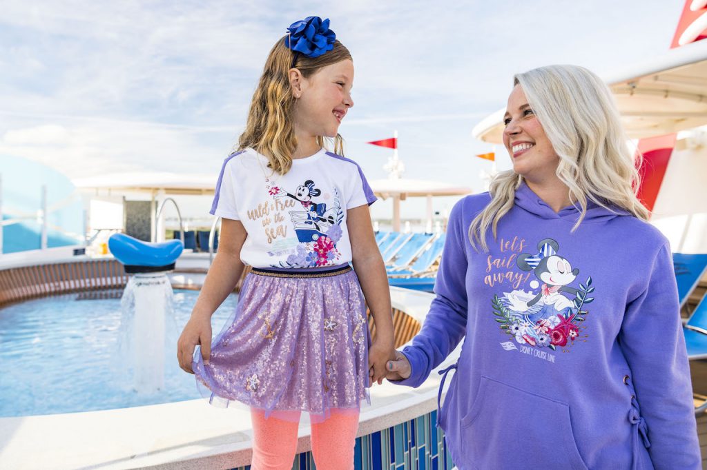 There’s something for everyone in this collection, for adults you can choose from adorable sweatshirts and hoodies or t-shirts with rose gold accents and lavender tones. There’s also a Loungefly backpack featuring Captain Minnie and a clutch with floral accents to seas every day.