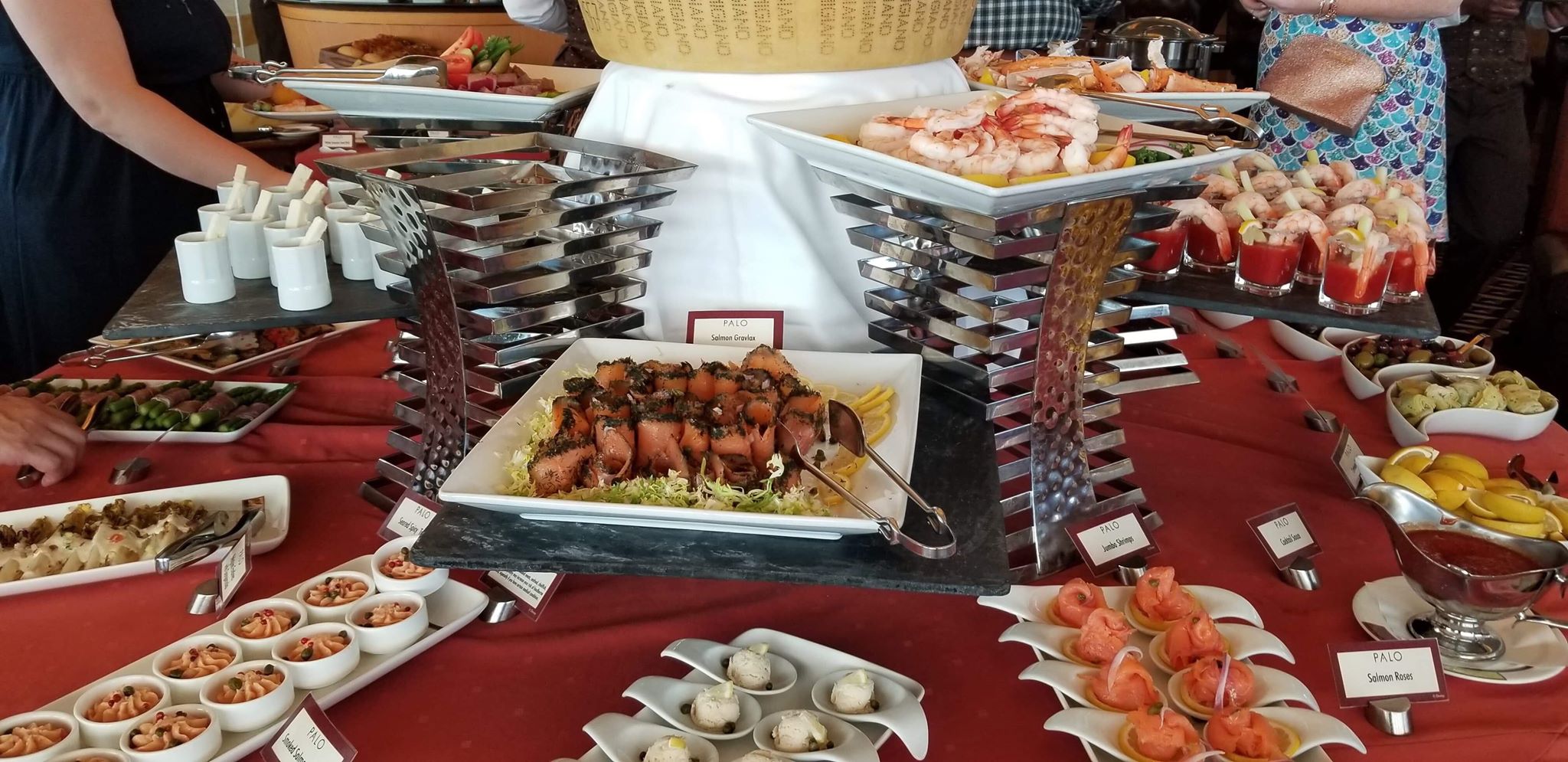 The brunch at Palo is offered on most days at sea on each of the 4 Disney cruise ships (Disney Dream, Disney Magic, Disney Wonder, and Disney Fantasy). The buffet offers a wide selection of Italian meats, cheeses, fruit, Bloody Mary shooters (with a side of shrimp), king crab, pizza and so much more. Make sure you save some room for the warm cinnamon rolls (watch our video to see these sticky sugary treats)!