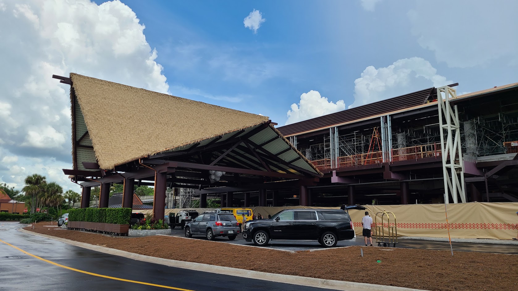 The Porte Cochere has been covered and the roof looks like the straw roof of a hut. Vehicles will be able to pass under and load/unload passengers.
