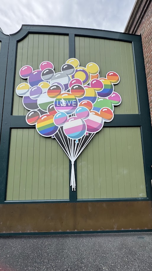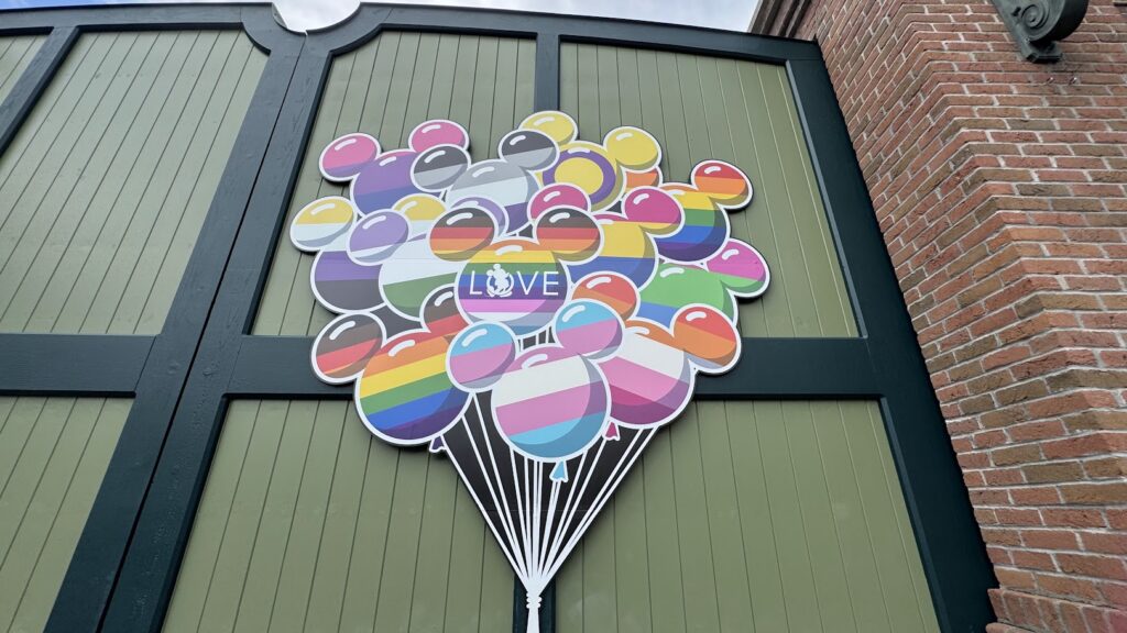 This flat placard, strategically placed on one of the park’s backstage access gates, offers a joyful and colorful backdrop for guests celebrating Pride. The Mickey balloons proudly display the patterns of several different LGBTQ+ flags, including the bisexual flag, the trans flag, the lesbian flag, the asexual flag, genderqueer flag, non-binary flag, and more, creating an inclusive and celebratory atmosphere.