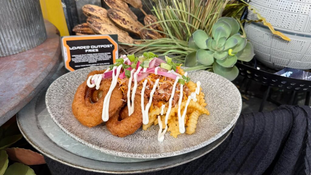 - Loaded Outpost Fries: Crinkle-cut fries and onion rings topped with BBQ pulled pork, cheddar and monterey jack blend, pickled red onions, roasted corn, sour cream drizzle, and green onion. Available at Galactic Grill.