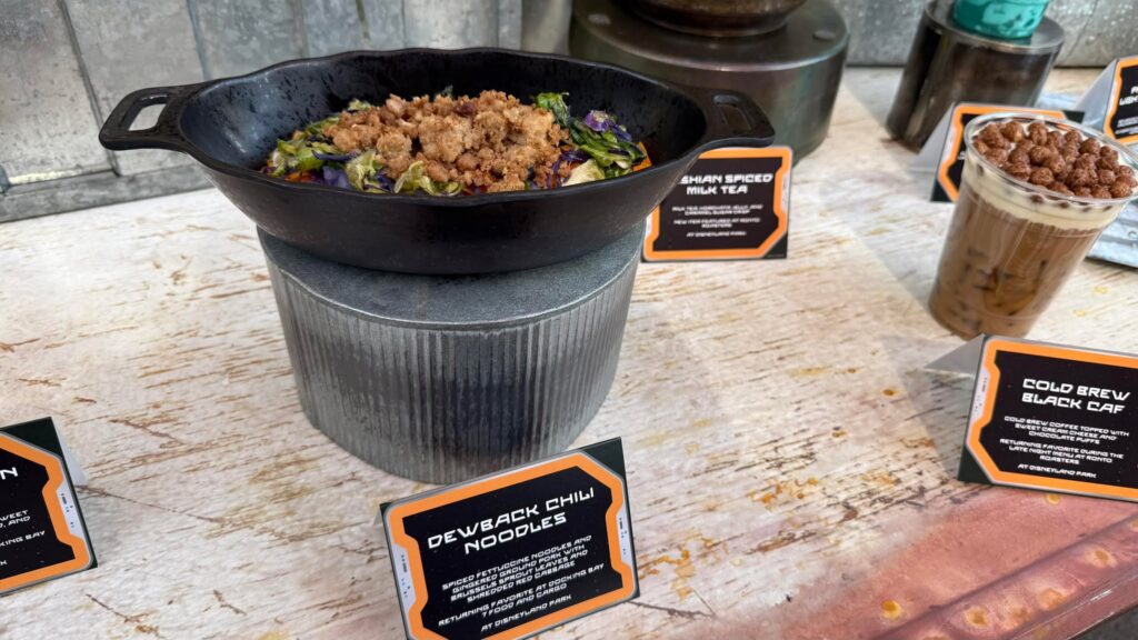 - Dewback Chili Noodles: Spiced fettuccini noodles and gingered ground pork with brussels sprout leaves and shredded red cabbage. Available at Docking Bay 7 Food & Cargo.