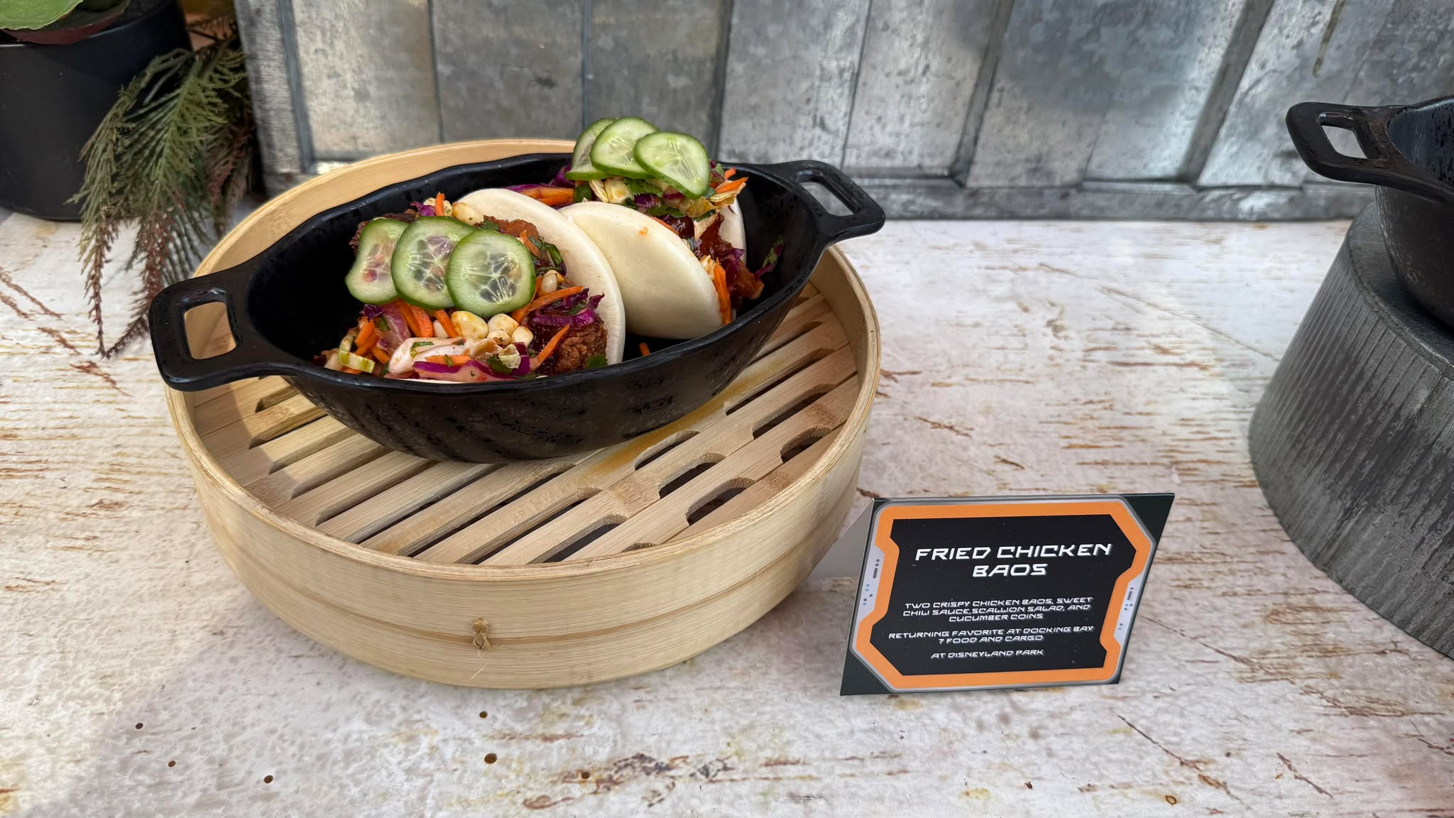 - Fried Chicken Baos: two crispy chicken baos, sweet chili sauce, scallion salad, and cucumber coins. Available at Docking Bay 7 Food and Cargo