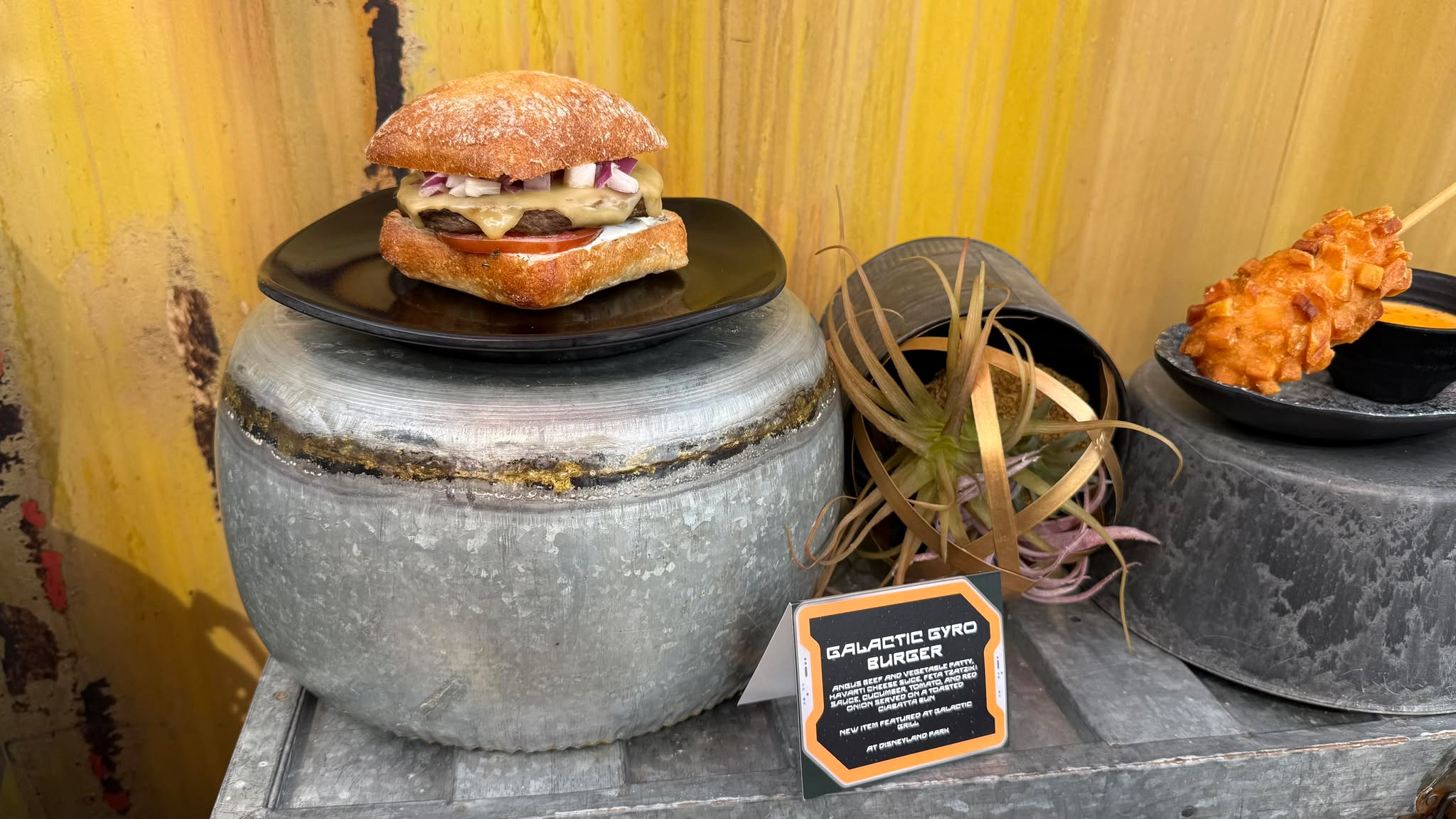- Galactic Gyro Burger: Angus beef and vegetable patty, Havarti cheese sauce, Feta Tzatziki sauce, cucumber, tomato, red onion, served on a toasted ciabatta bun. Available at Galactic Grill.