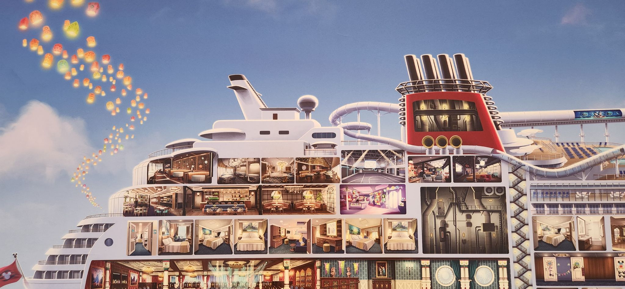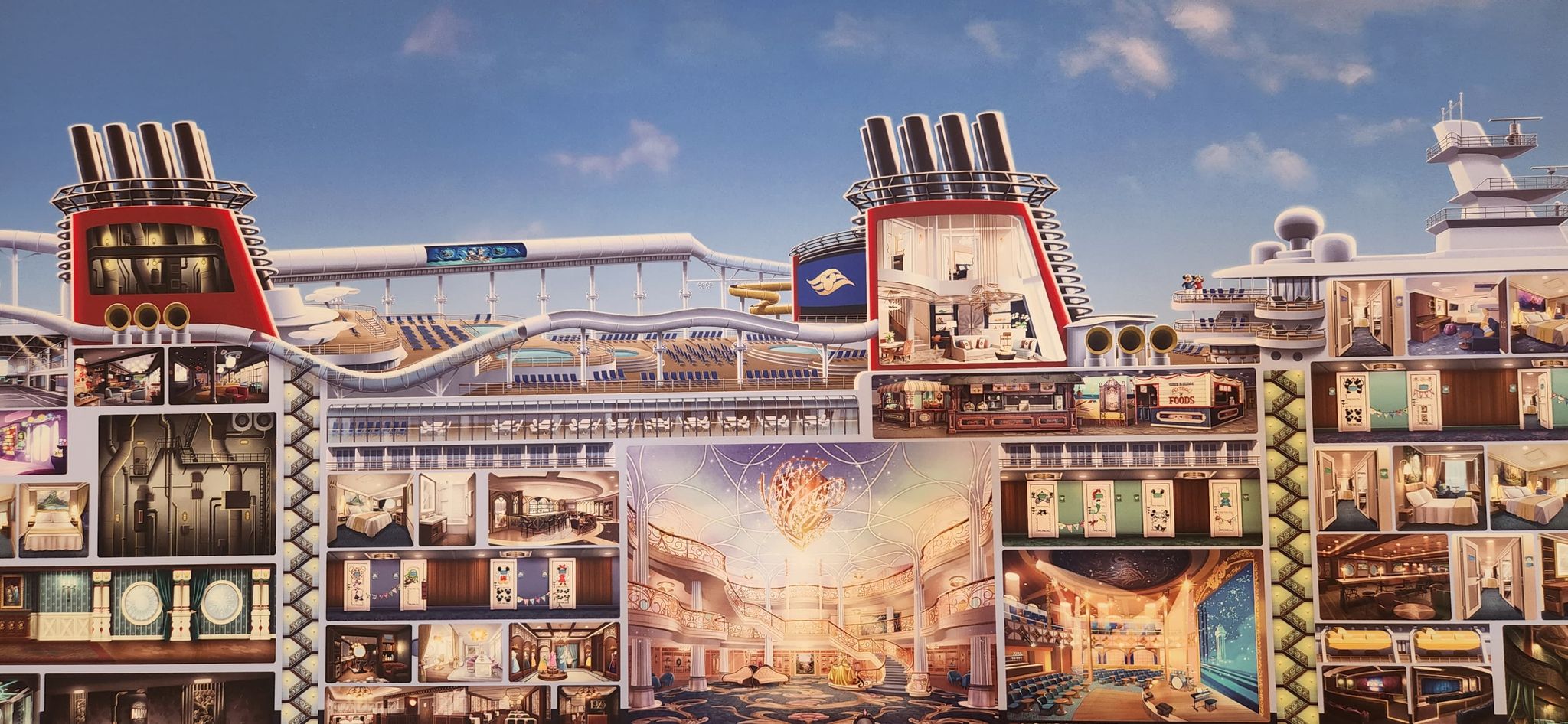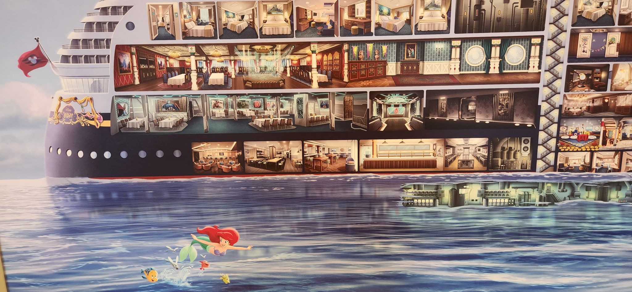 You can see in the artwork the normal things you will find on the Disney Wish, including the grand Entrance, the Staterooms, the Movie theaters, the new Showrooms that will play the new Little Mermaid show, and the new Frozen dining hall. Even the engine room is shown.